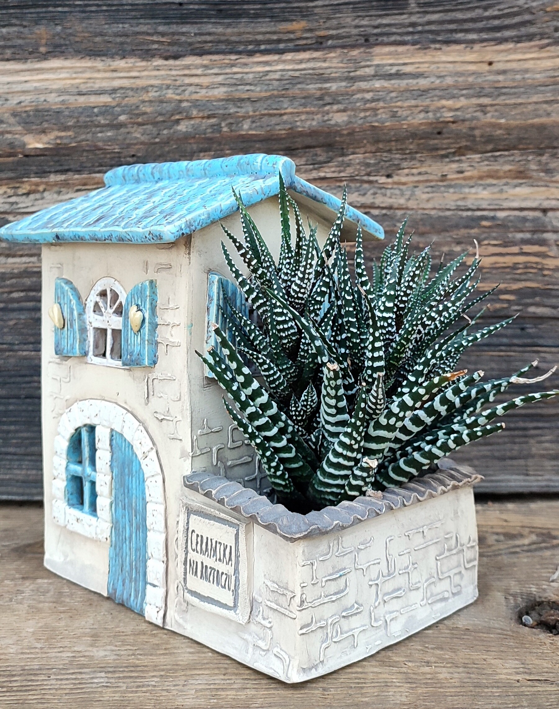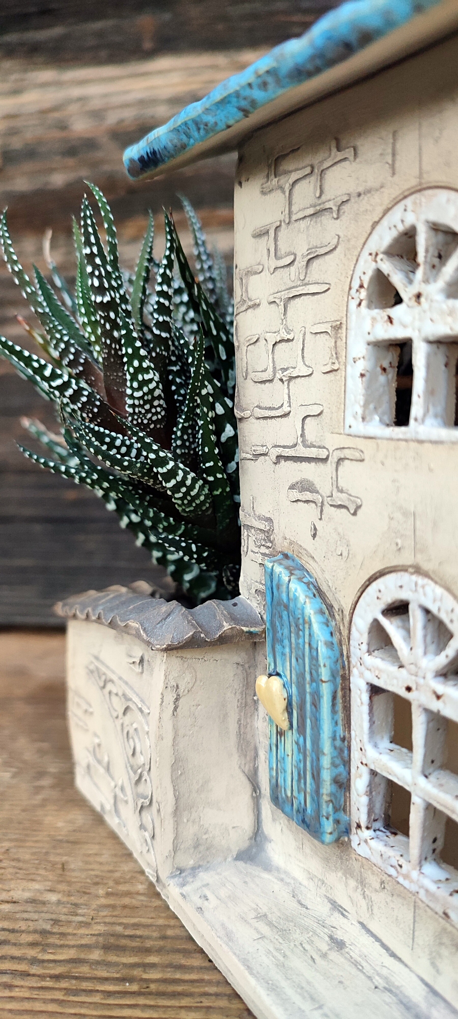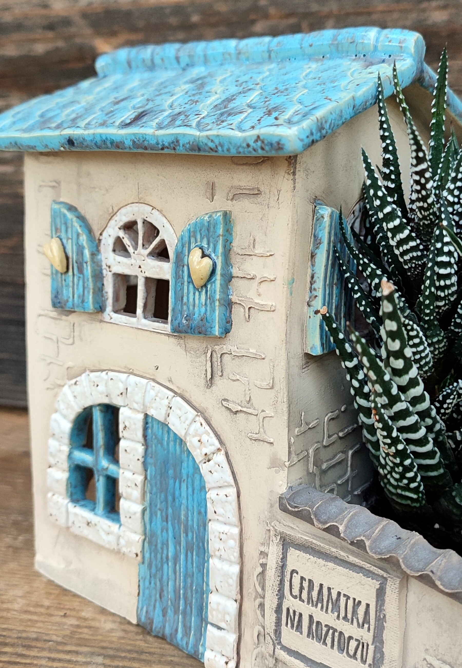 Po drugiej stronie domku znajduje się niewielka przestrzeń na sukulenta lub inną drobną roślinę — jak miniaturowe patio, które nadaje całości charakteru małej, domowej sceny.