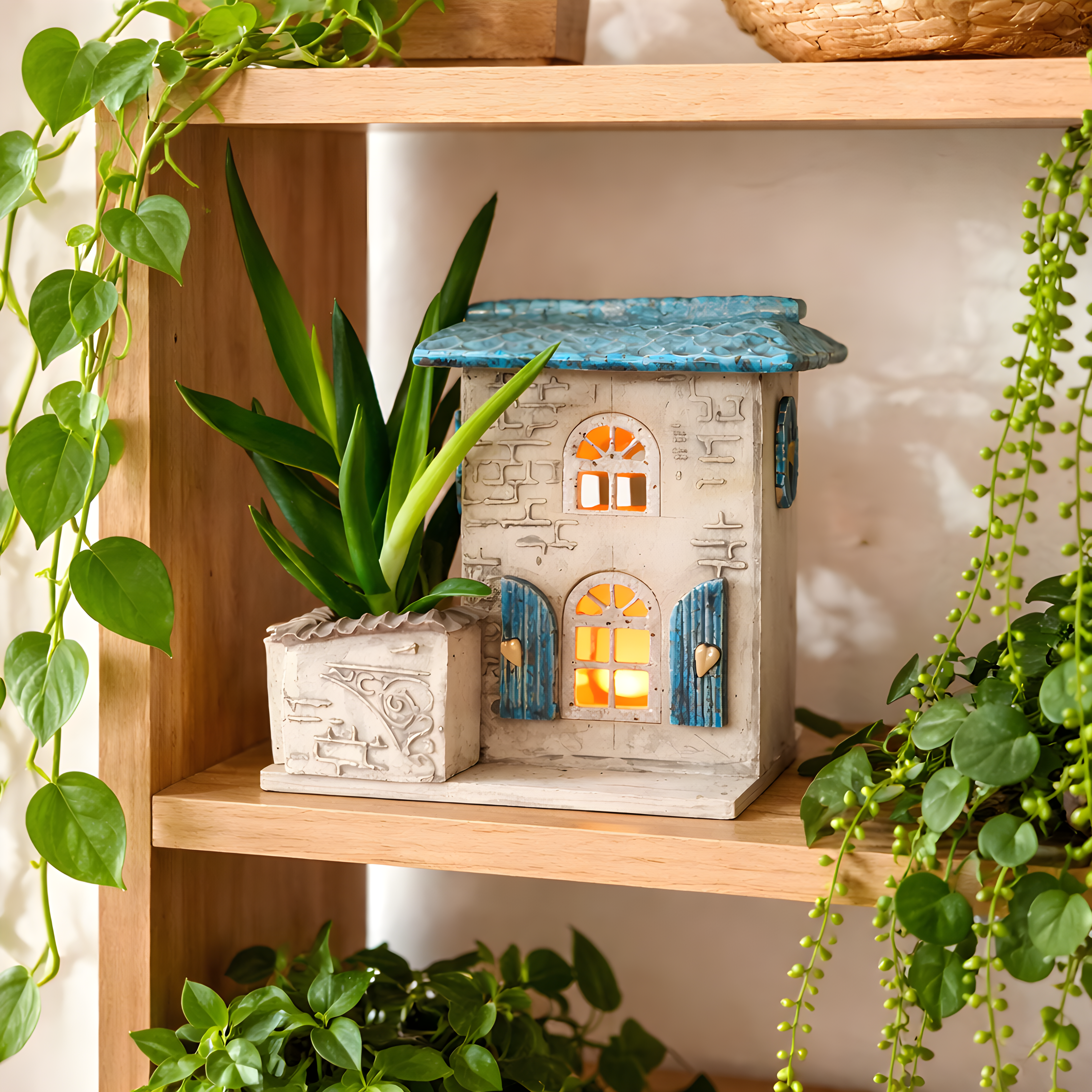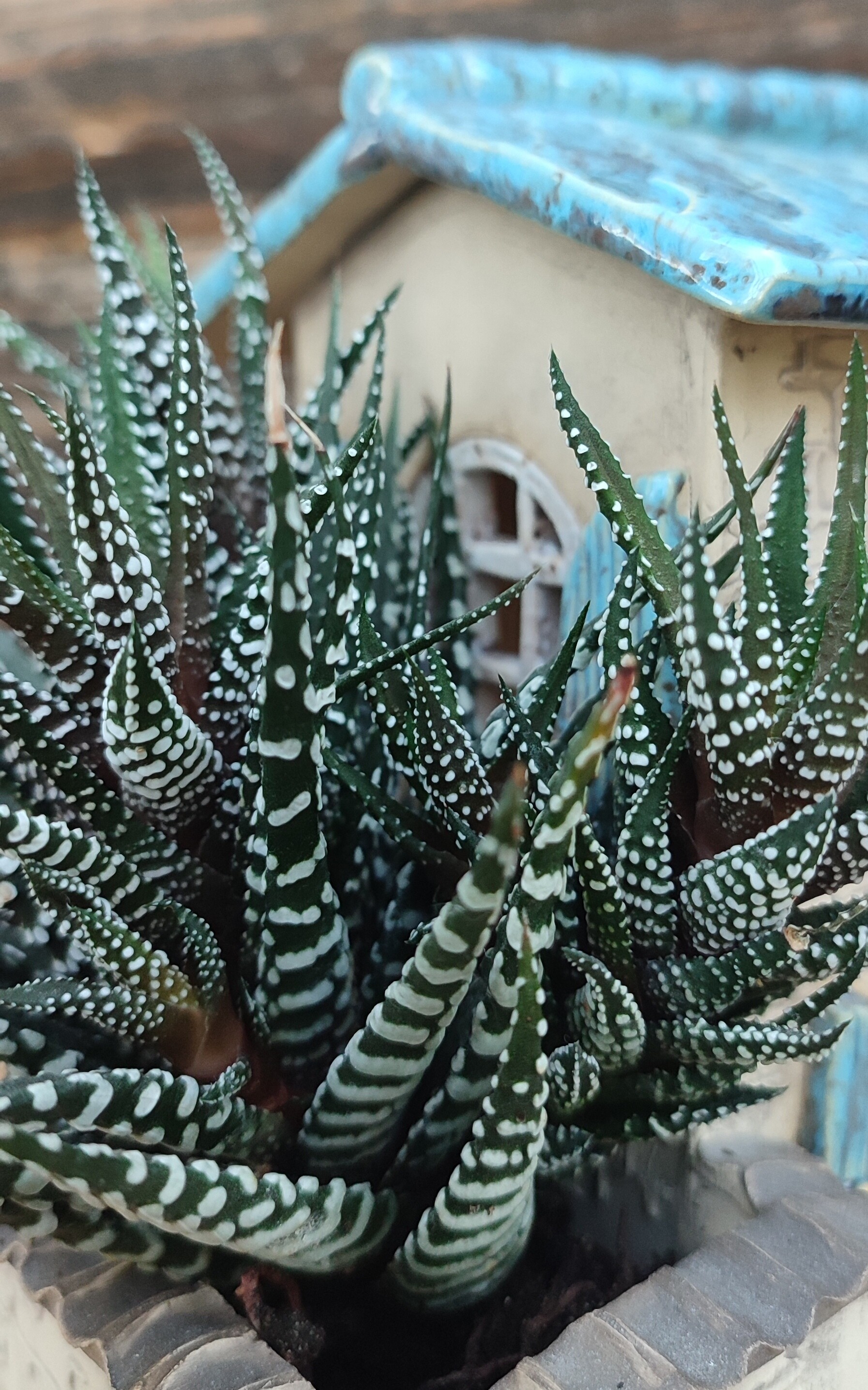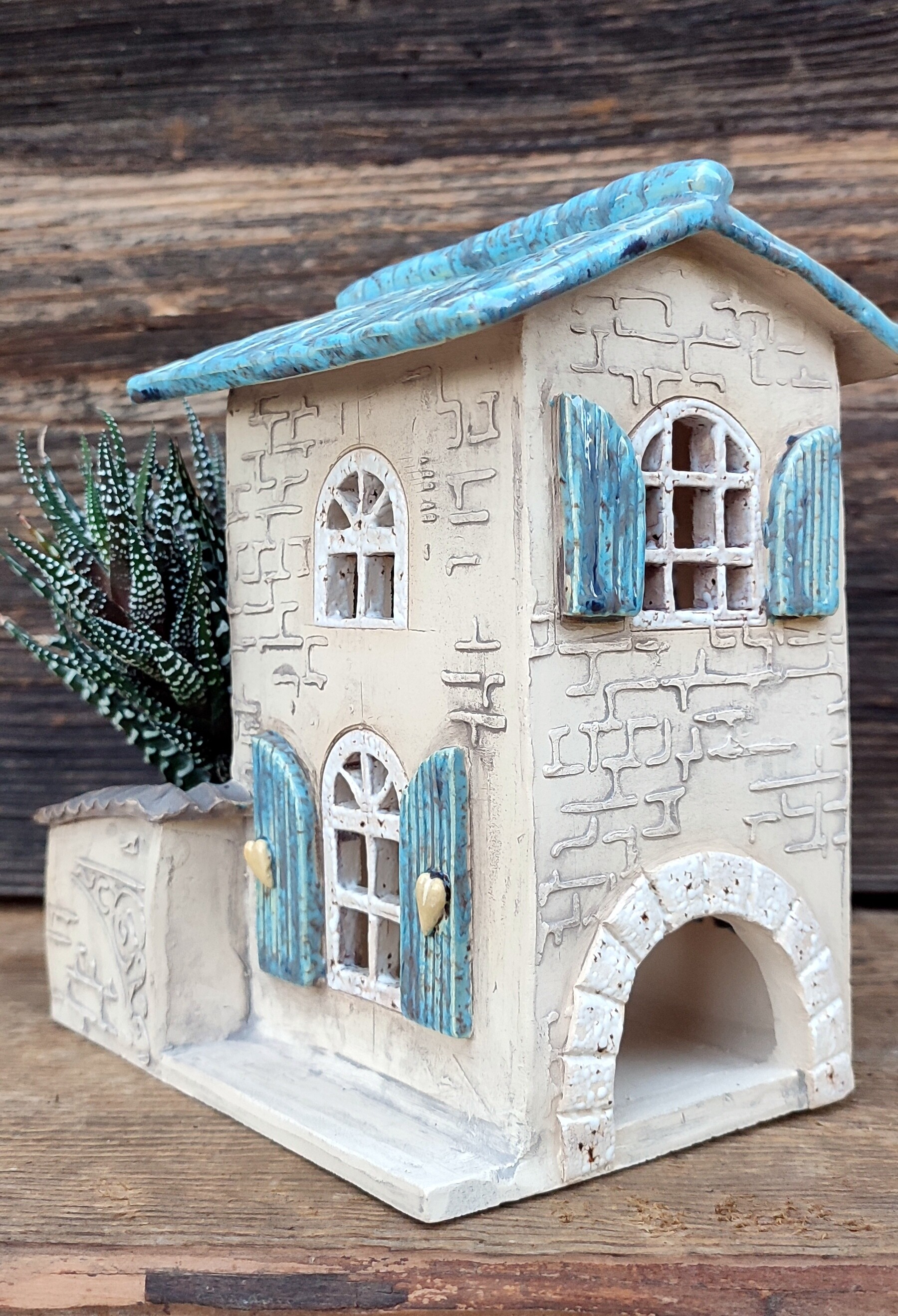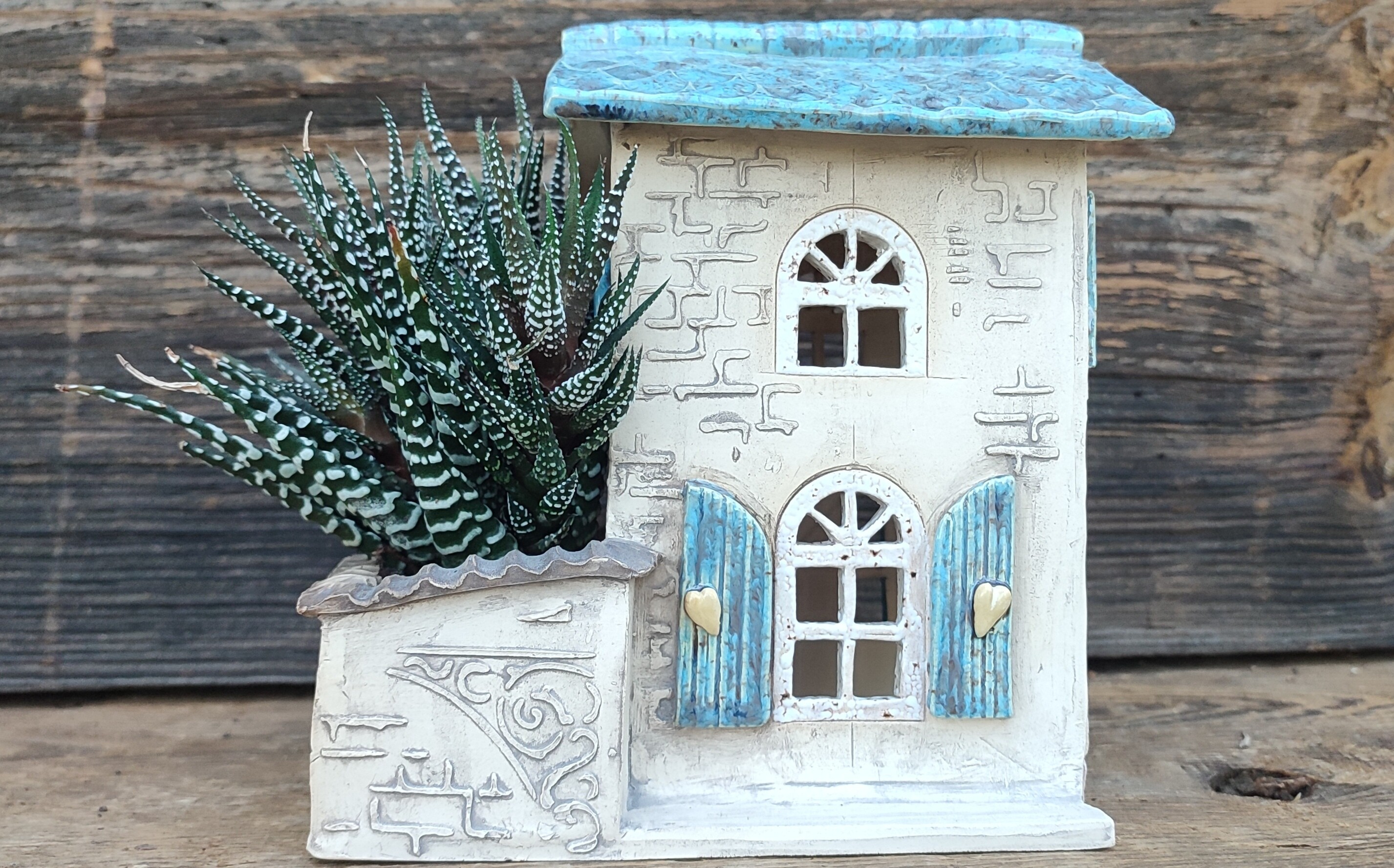 Po drugiej stronie domku znajduje się niewielka przestrzeń na sukulenta lub inną drobną roślinę — jak miniaturowe patio, które nadaje całości charakteru małej, domowej sceny.