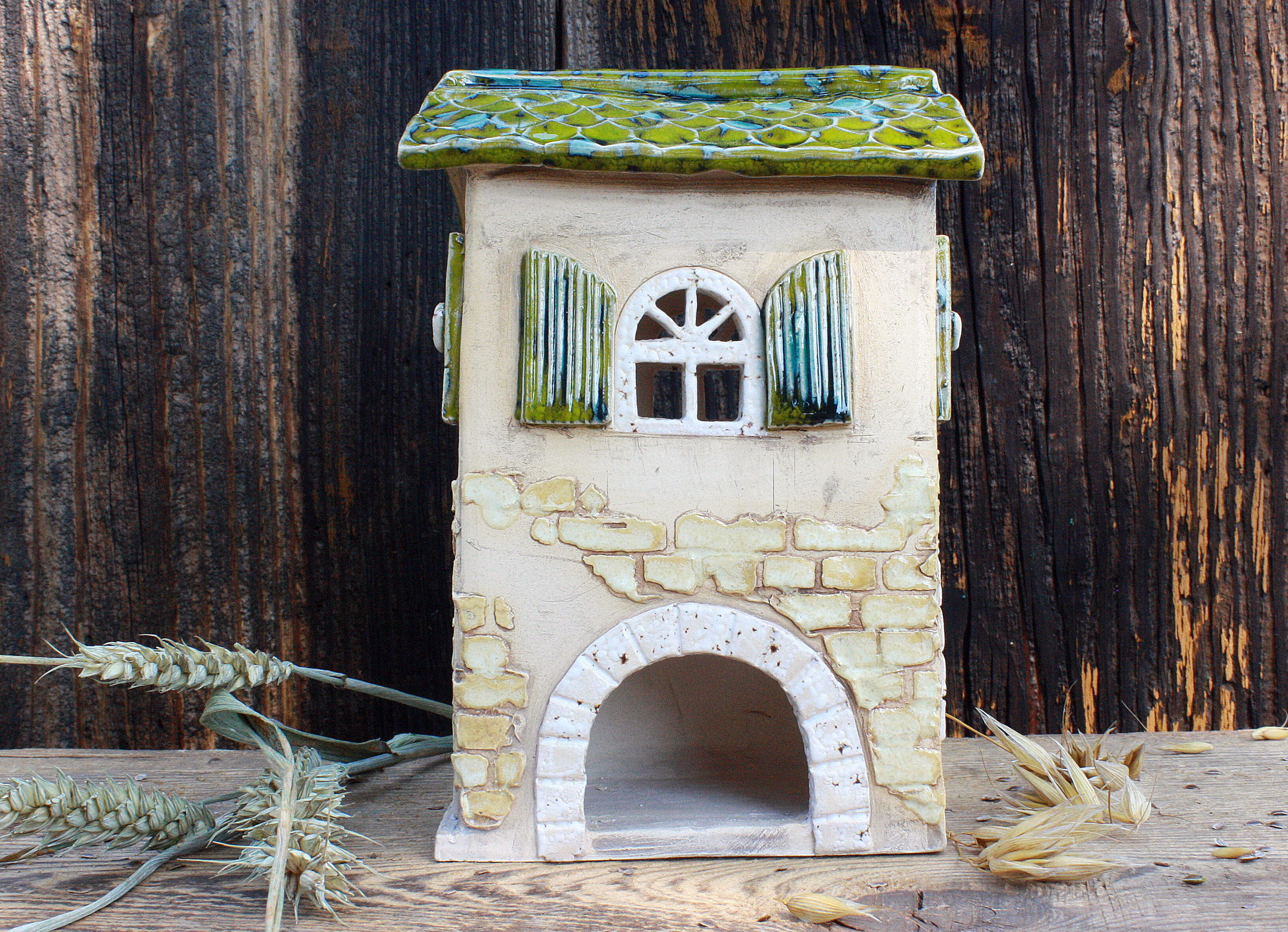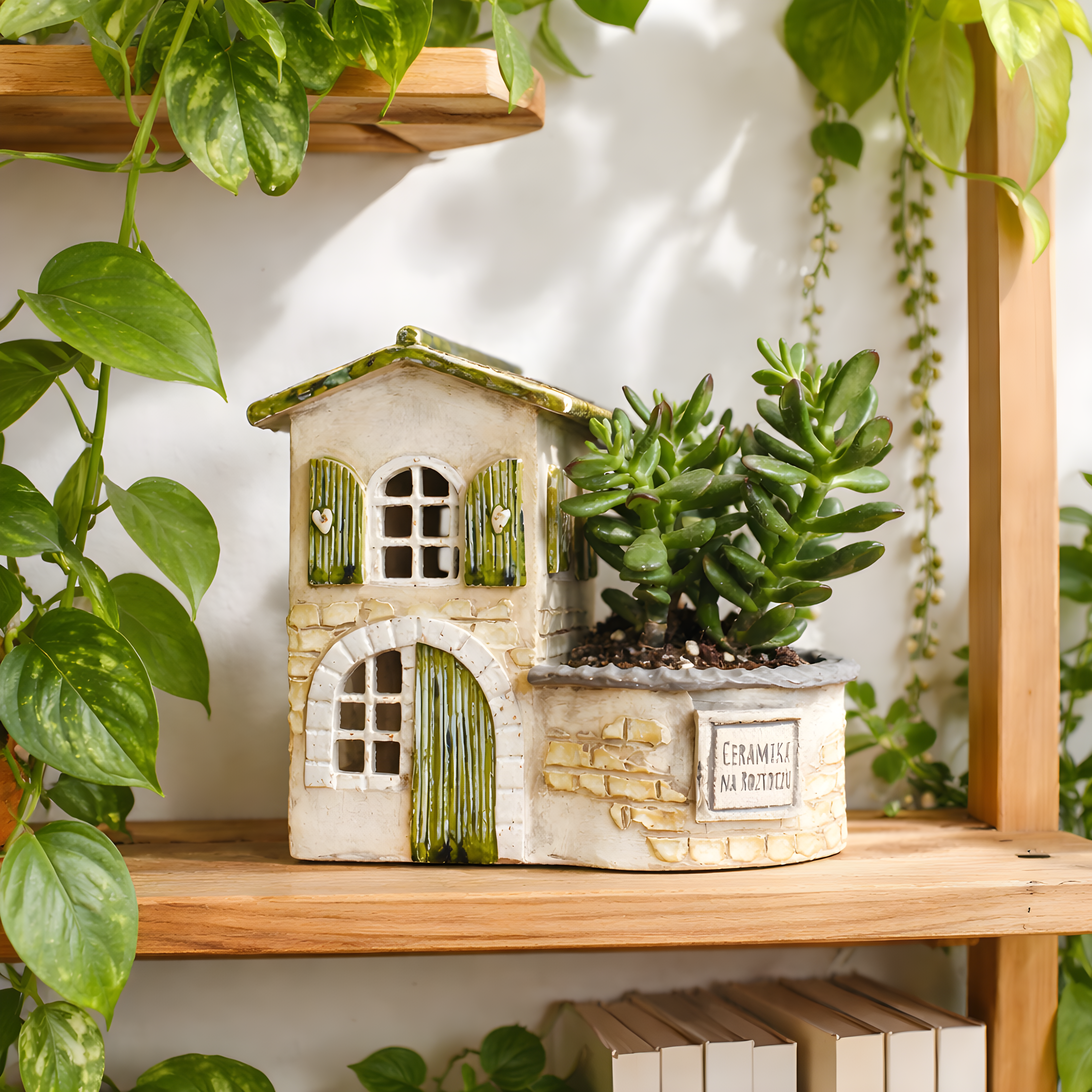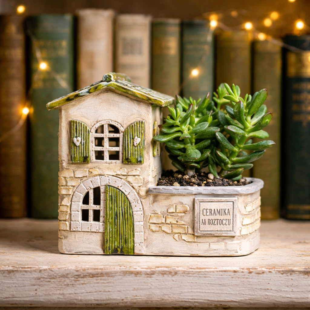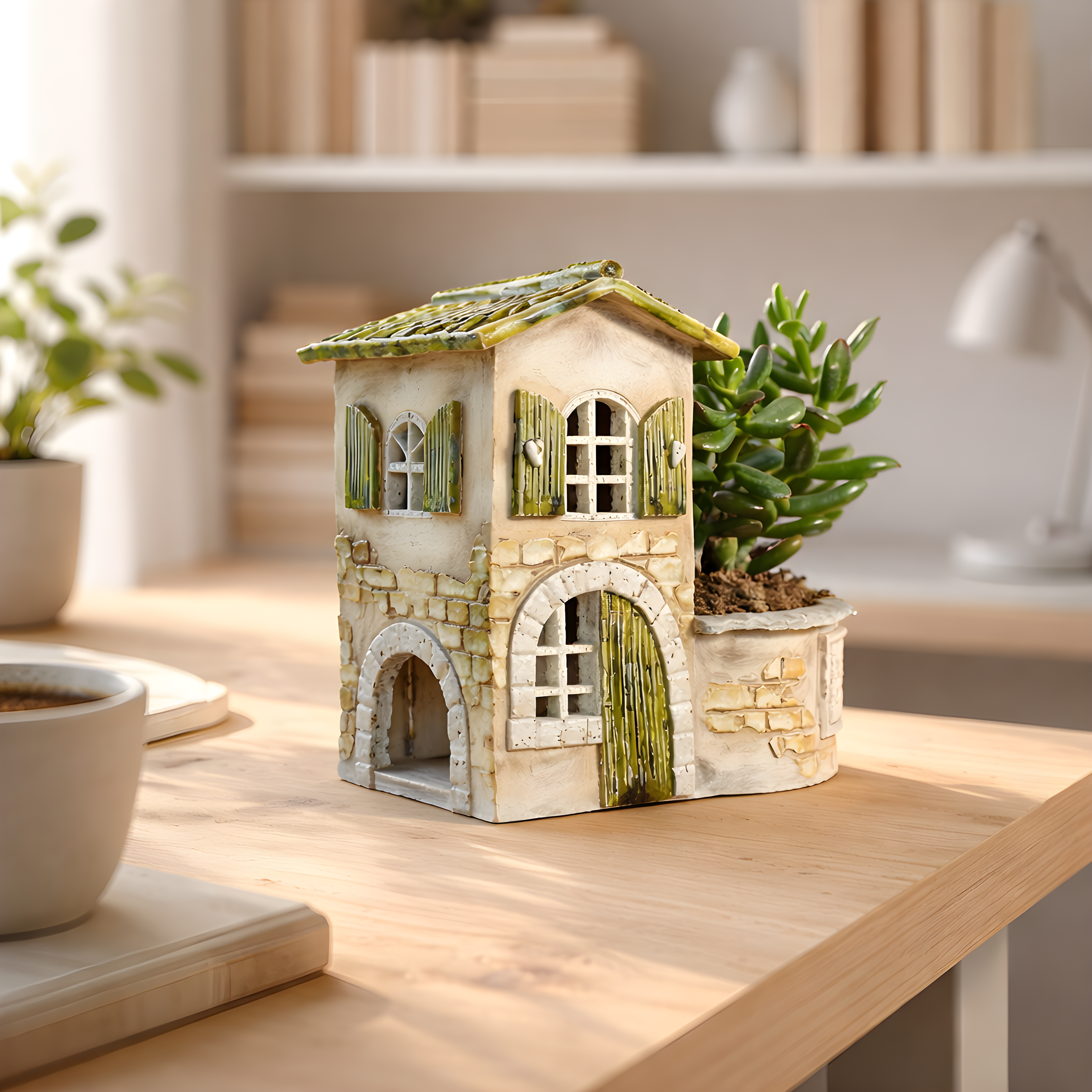 Ten domek to połączenie ceramiki i zieleni w najbardziej naturalnej formie. Szkliwione, oliwkowe okiennice i dach w odcieniach zieleni nadają mu charakter domu z małego, ciepłego miasteczka, gdzie wszystko dzieje się wolniej. Teksturowane mury i nieregularne cegiełki podkreślają ręczne wykonanie — każdy fragment został uformowany i dopracowany osobno.