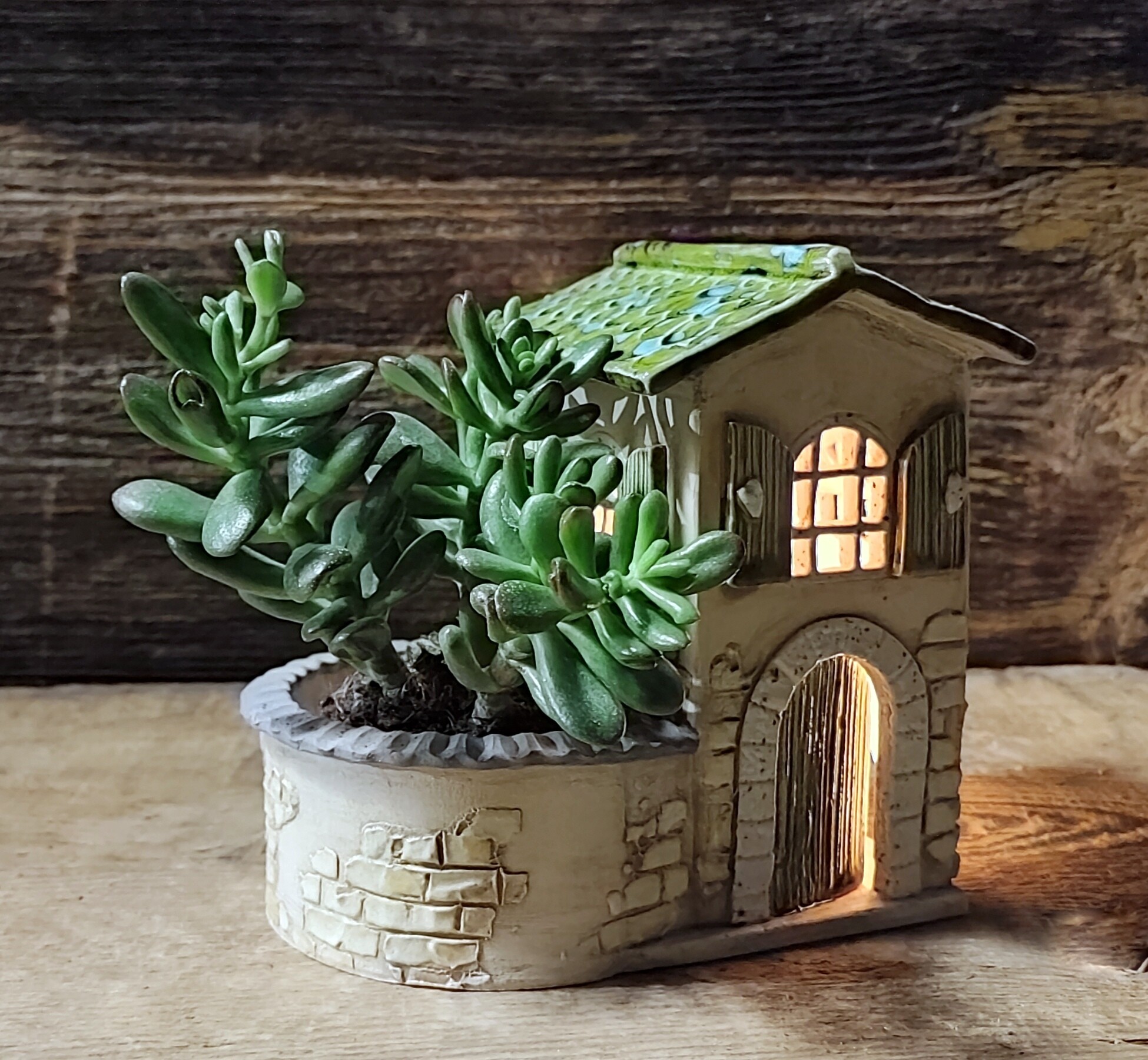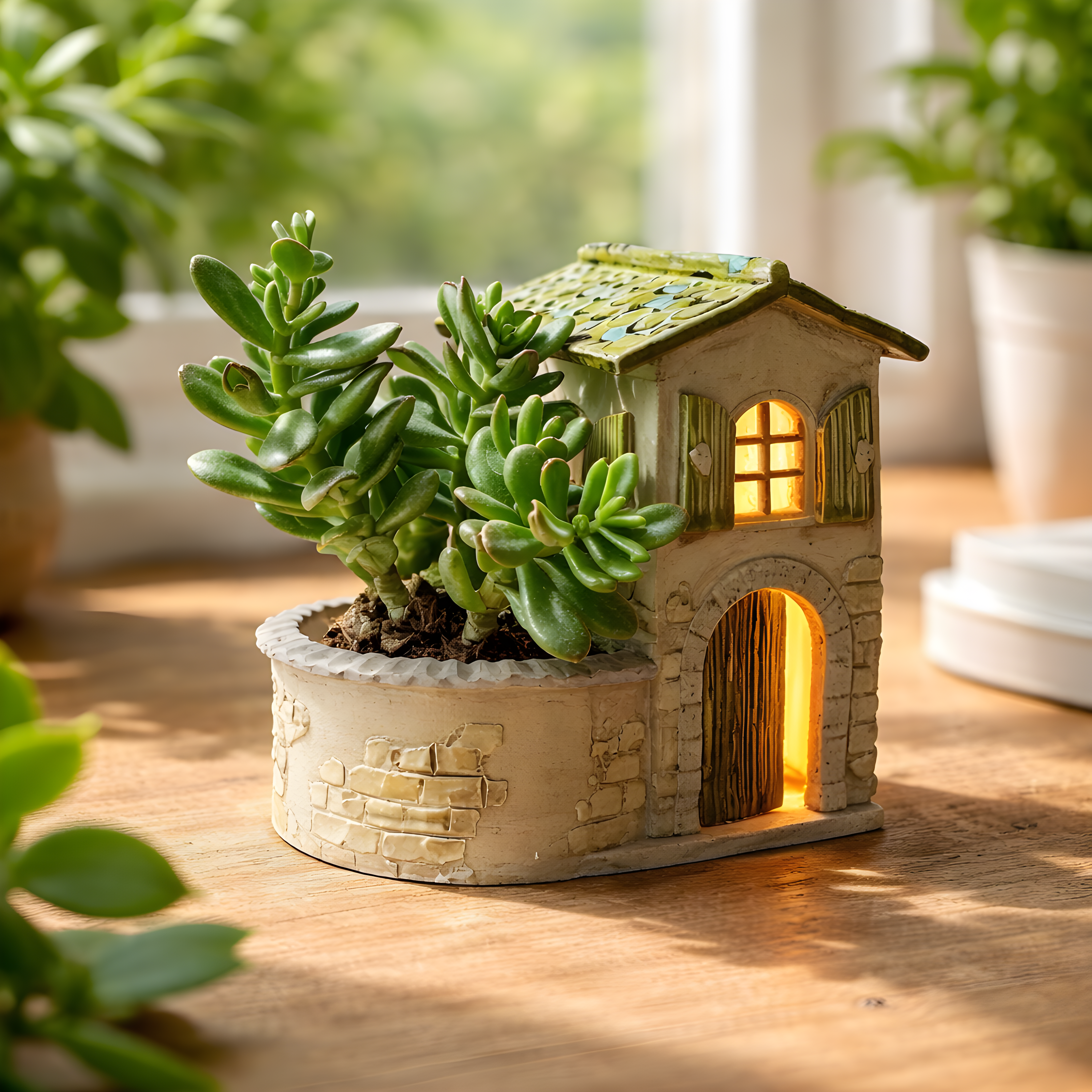 Po zmroku domek zamienia się w delikatny lampion. Światło przechodzi przez drobne okienka, wydobywając ich kształt i sprawiając, że całość wygląda jak mała scena z życia, uchwycona w glinie.
