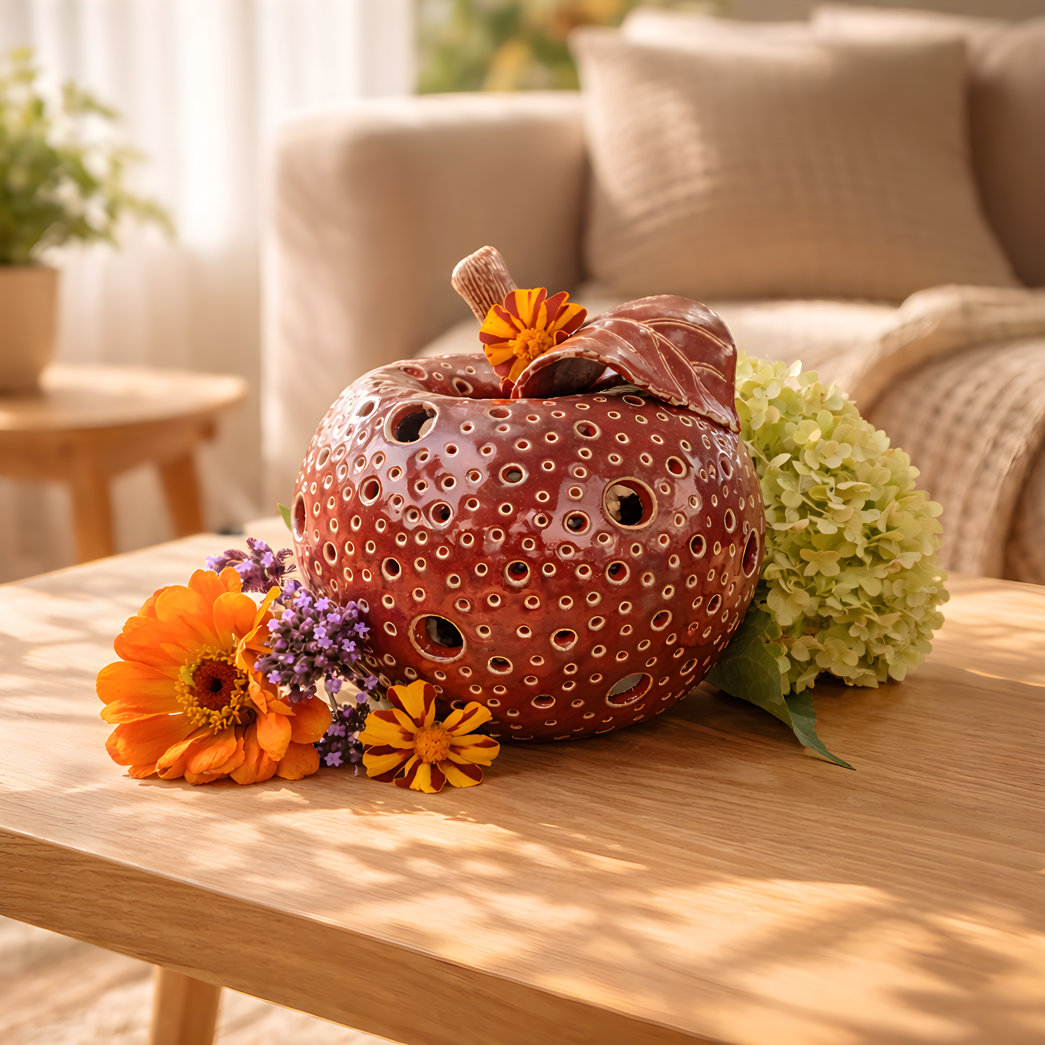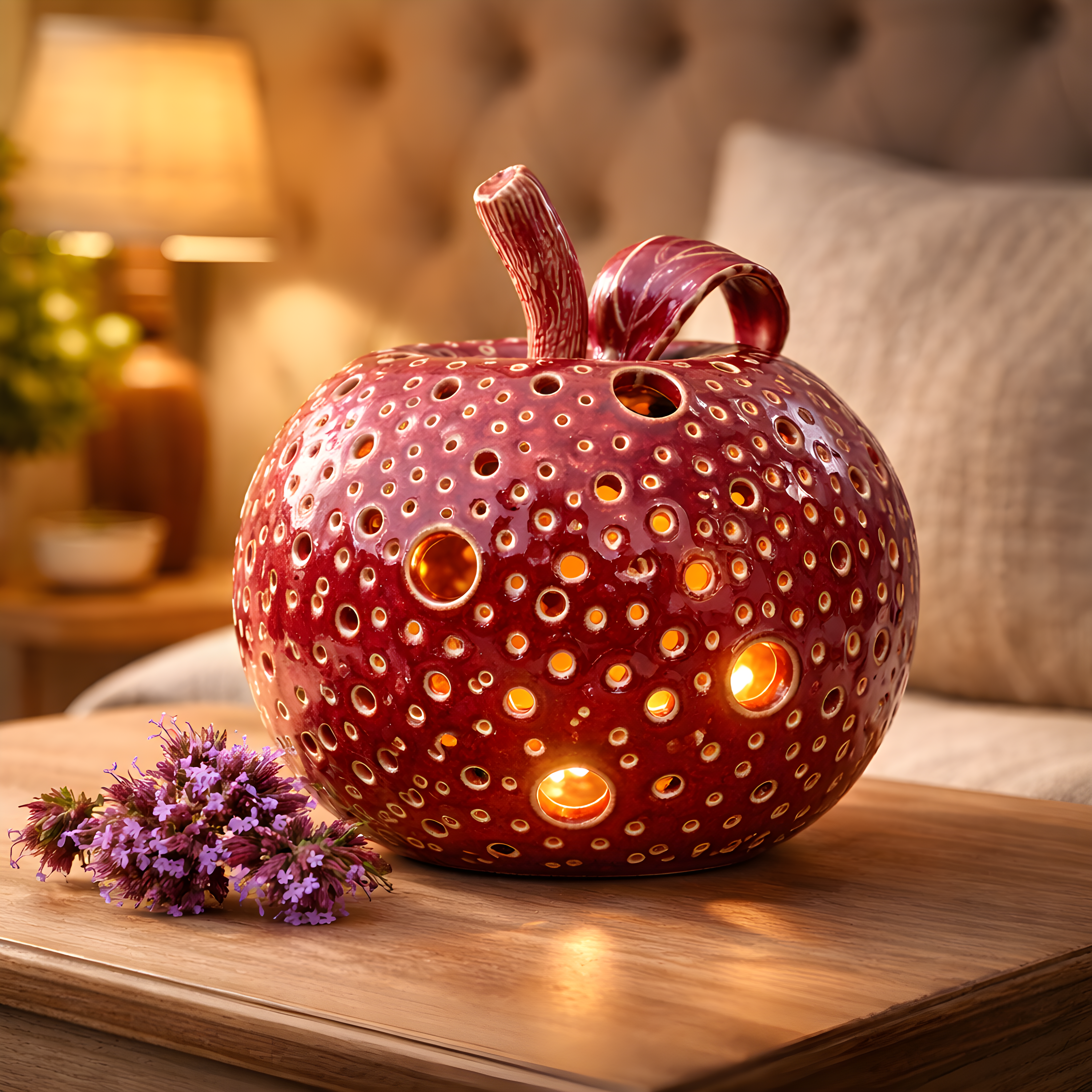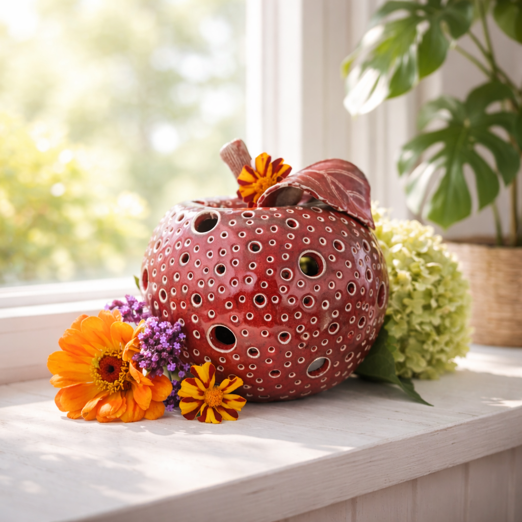 To jabłko z gliny ma w sobie coś z jesiennego spokoju – głęboki, winny kolor szkliwa, miękką formę i ciepło, które pojawia się, gdy zapalisz w nim świeczkę.