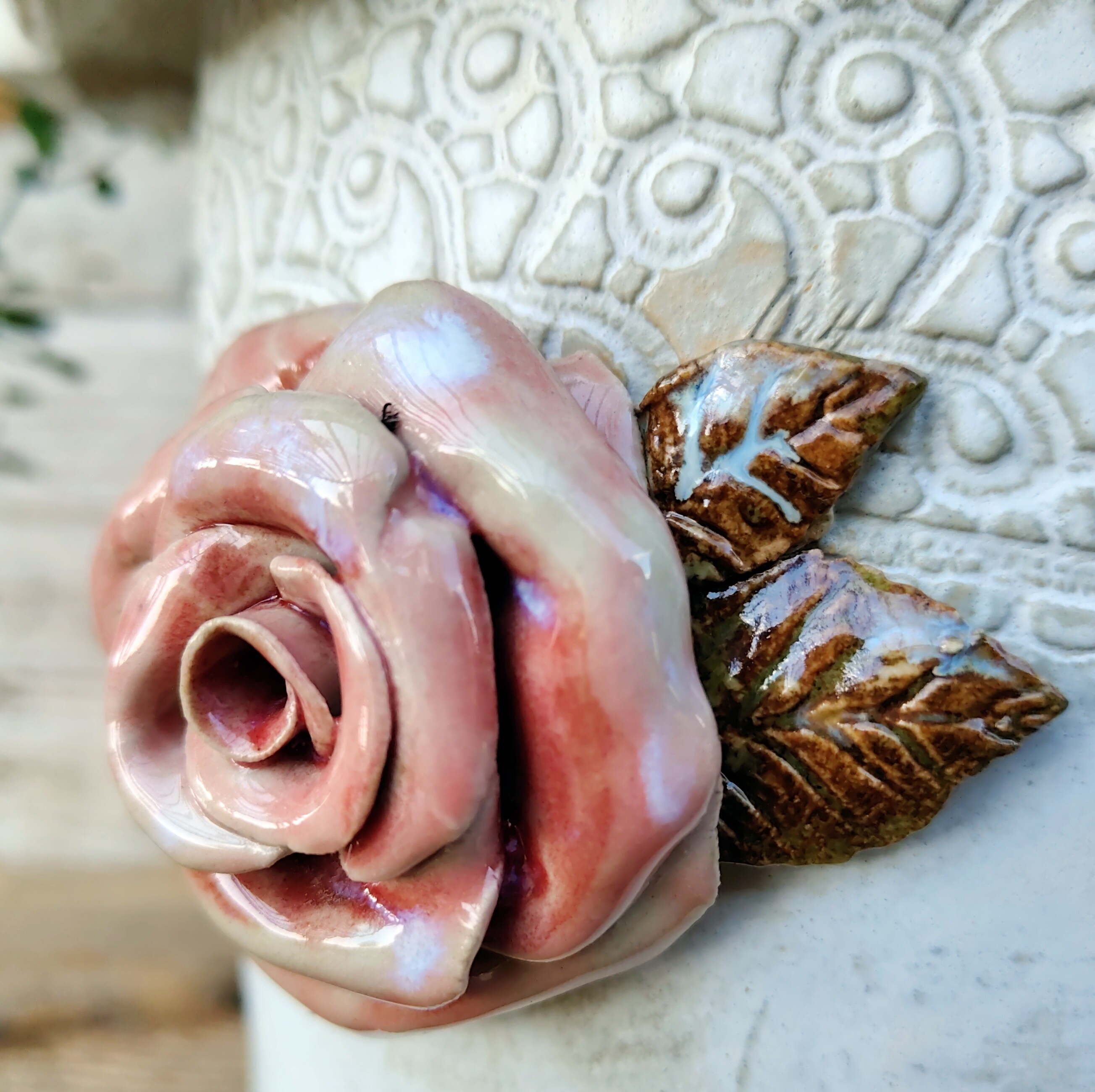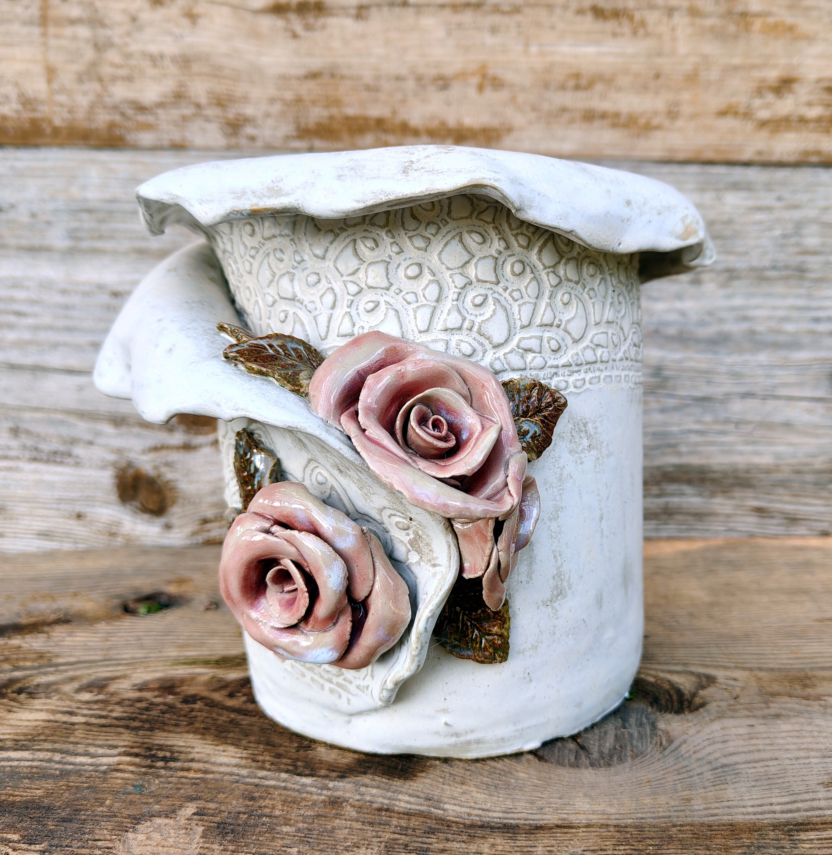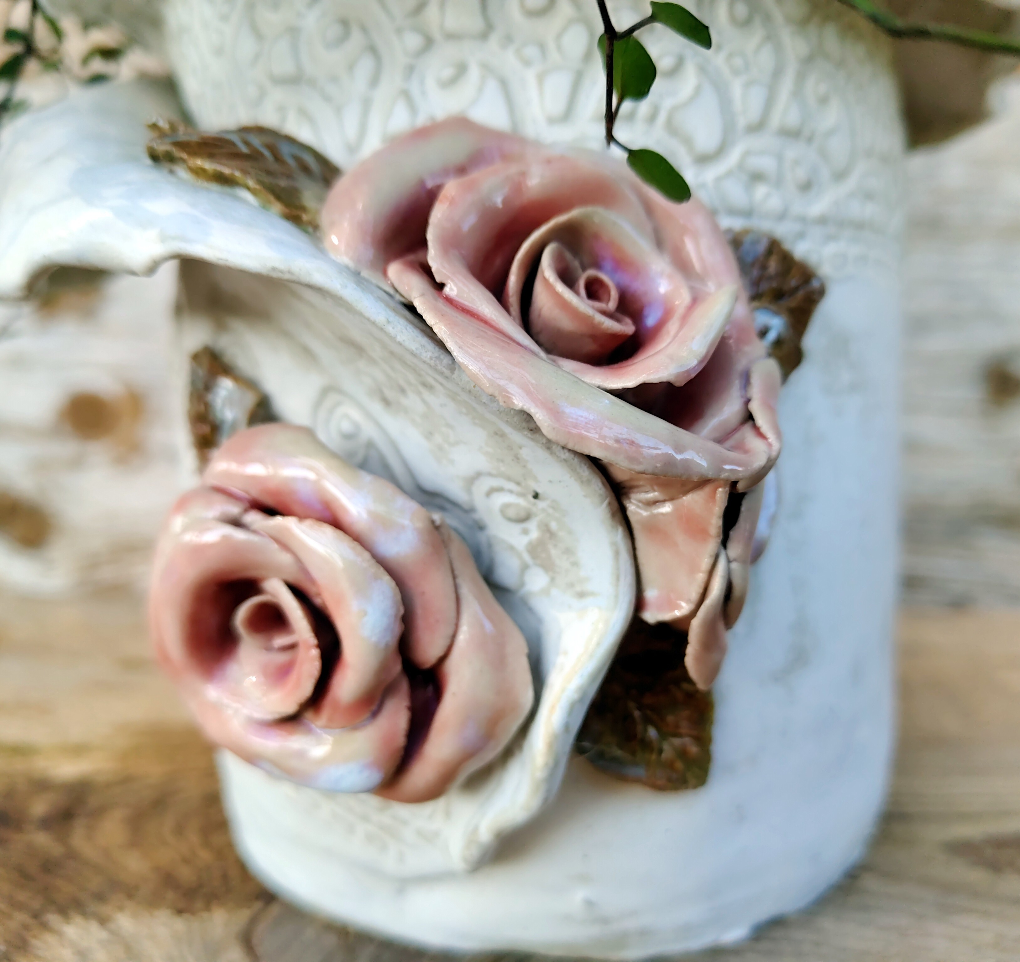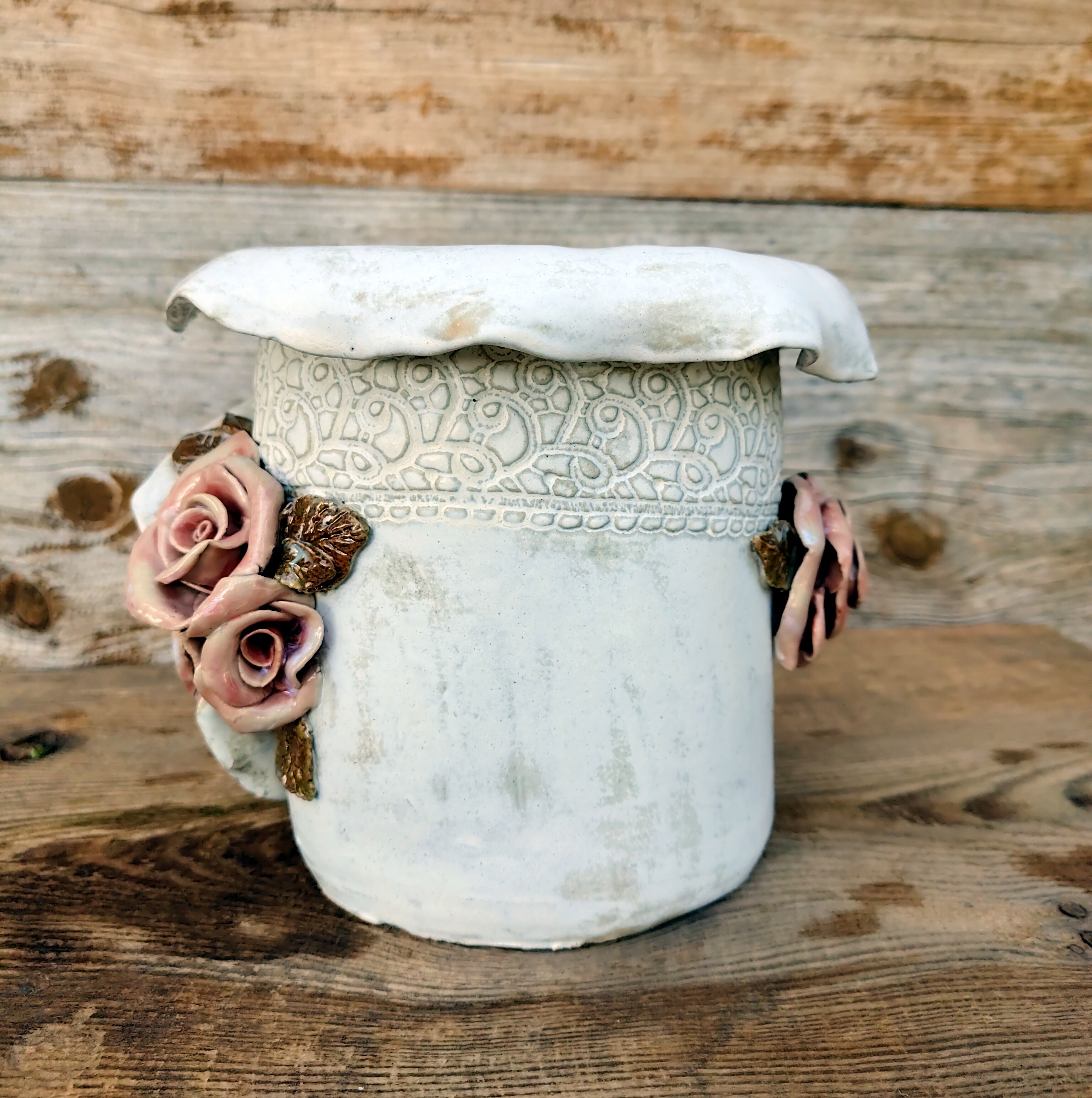Jej powierzchnię zdobi odcisk koronki – subtelny ornament, który przywołuje na myśl wspomnienia starych serwet, porcelany i ciepłych kuchni pełnych światła. Jasnokremowe szkliwo o satynowym połysku pięknie współgra z koralowymi różami uformowanymi ręcznie z gliny.