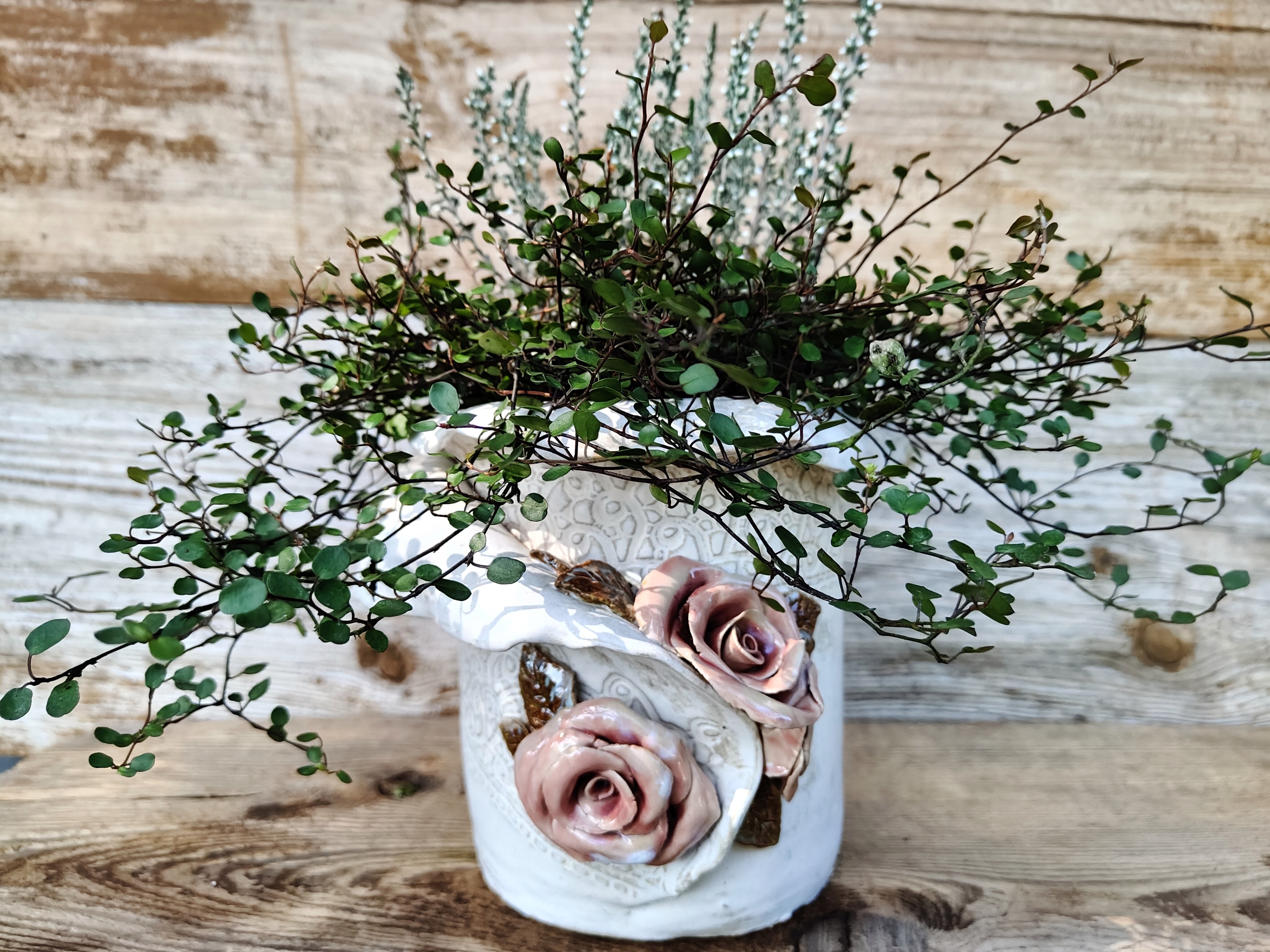 Każdy płatek został ułożony z dbałością o szczegół, tworząc kwiaty pełne miękkości i życia. Doniczka ma łagodnie pofalowany rant, który nadaje jej lekkość i kobiecy wdzięk.