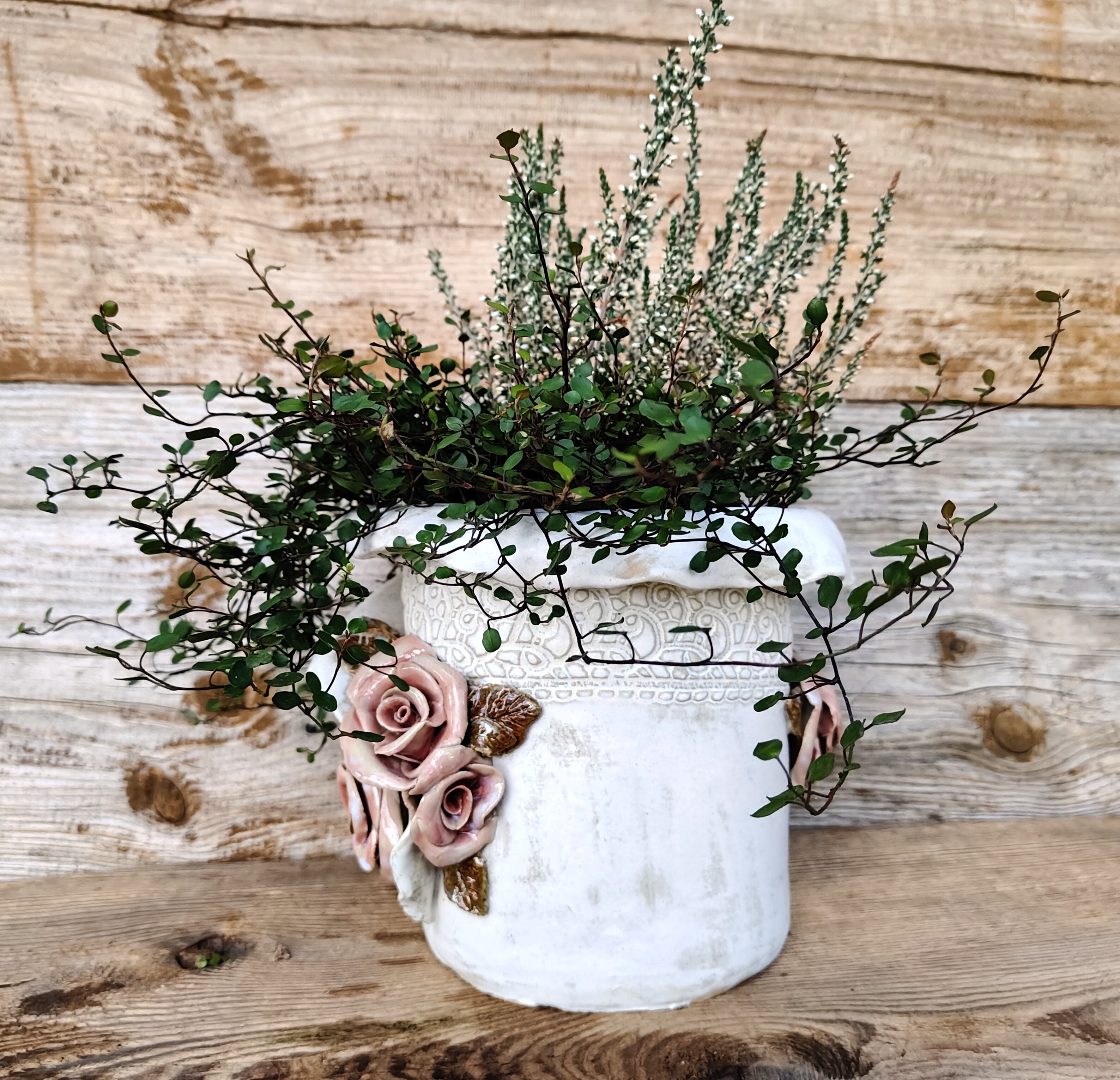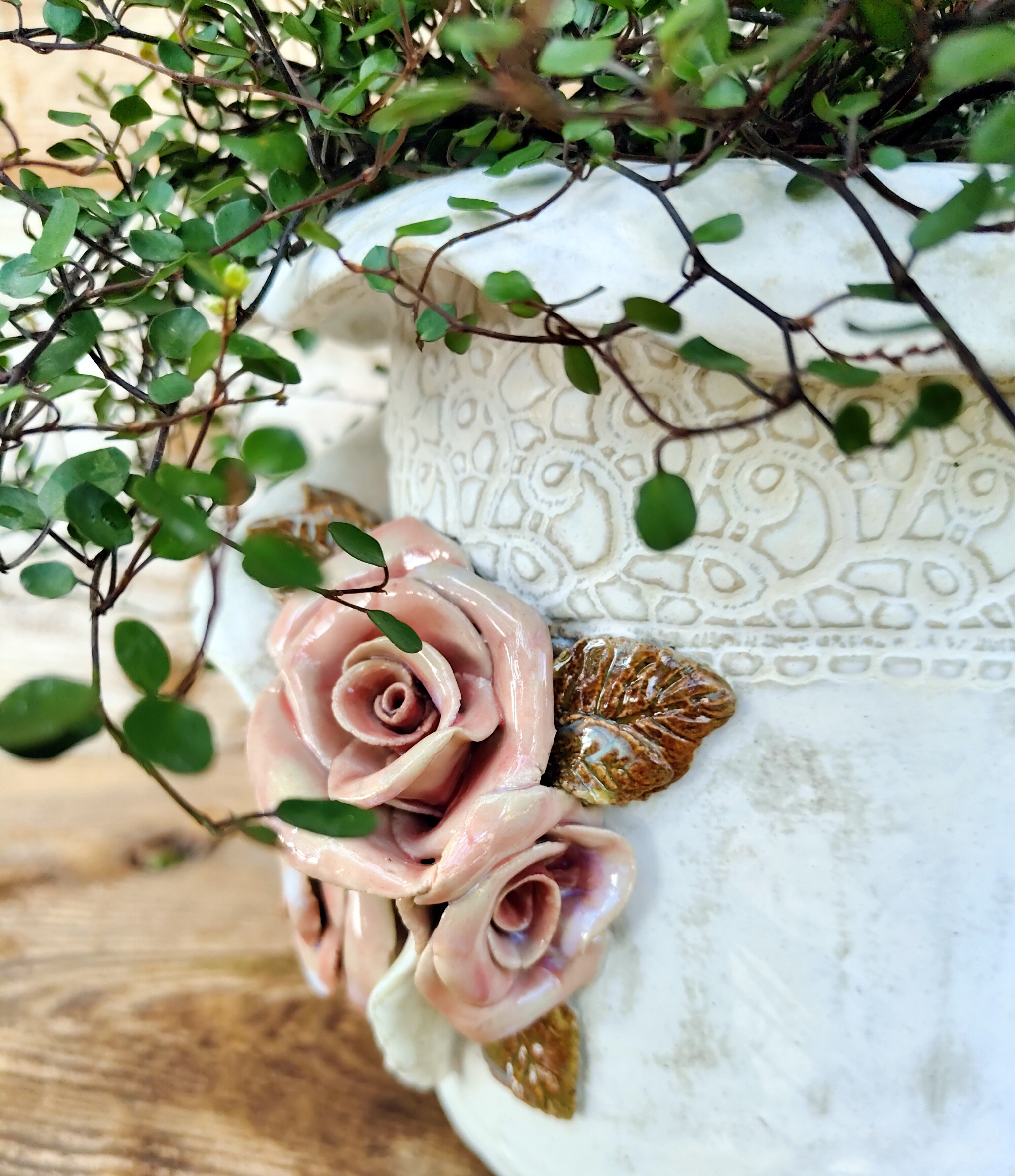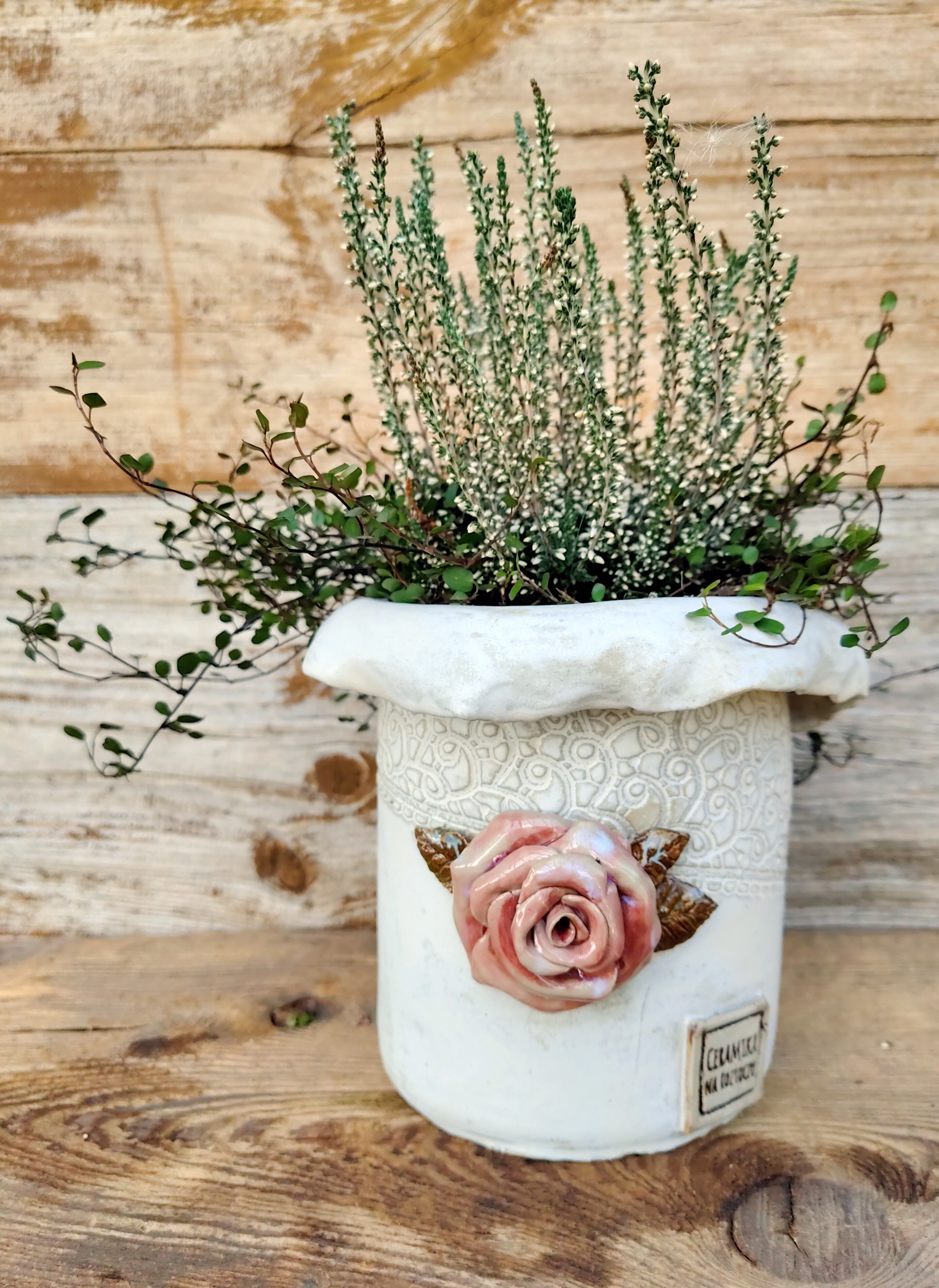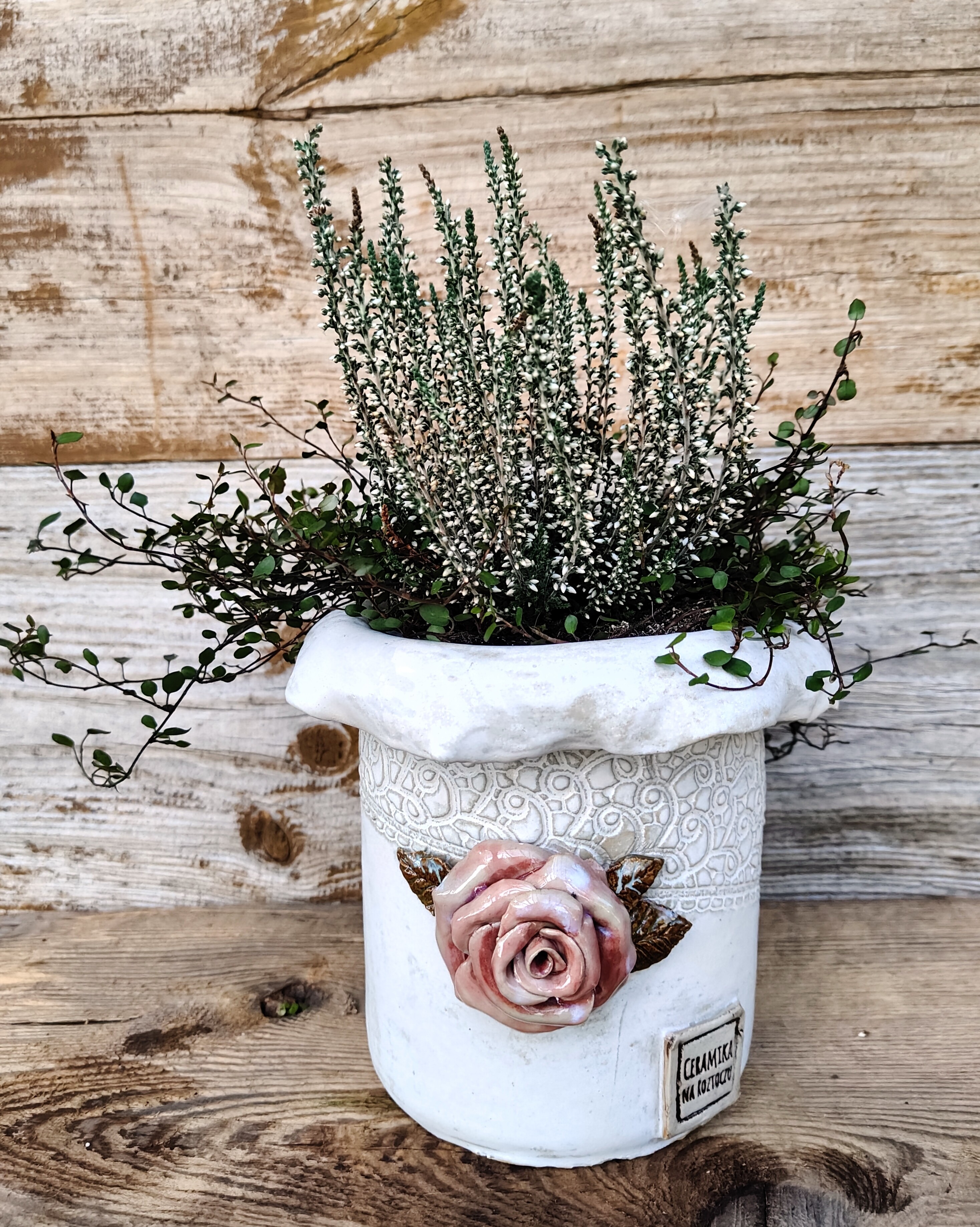 „Koronkowe wspomnienie” to doniczka, która przenosi w świat dawnych ogrodów i zapachu róż o poranku.