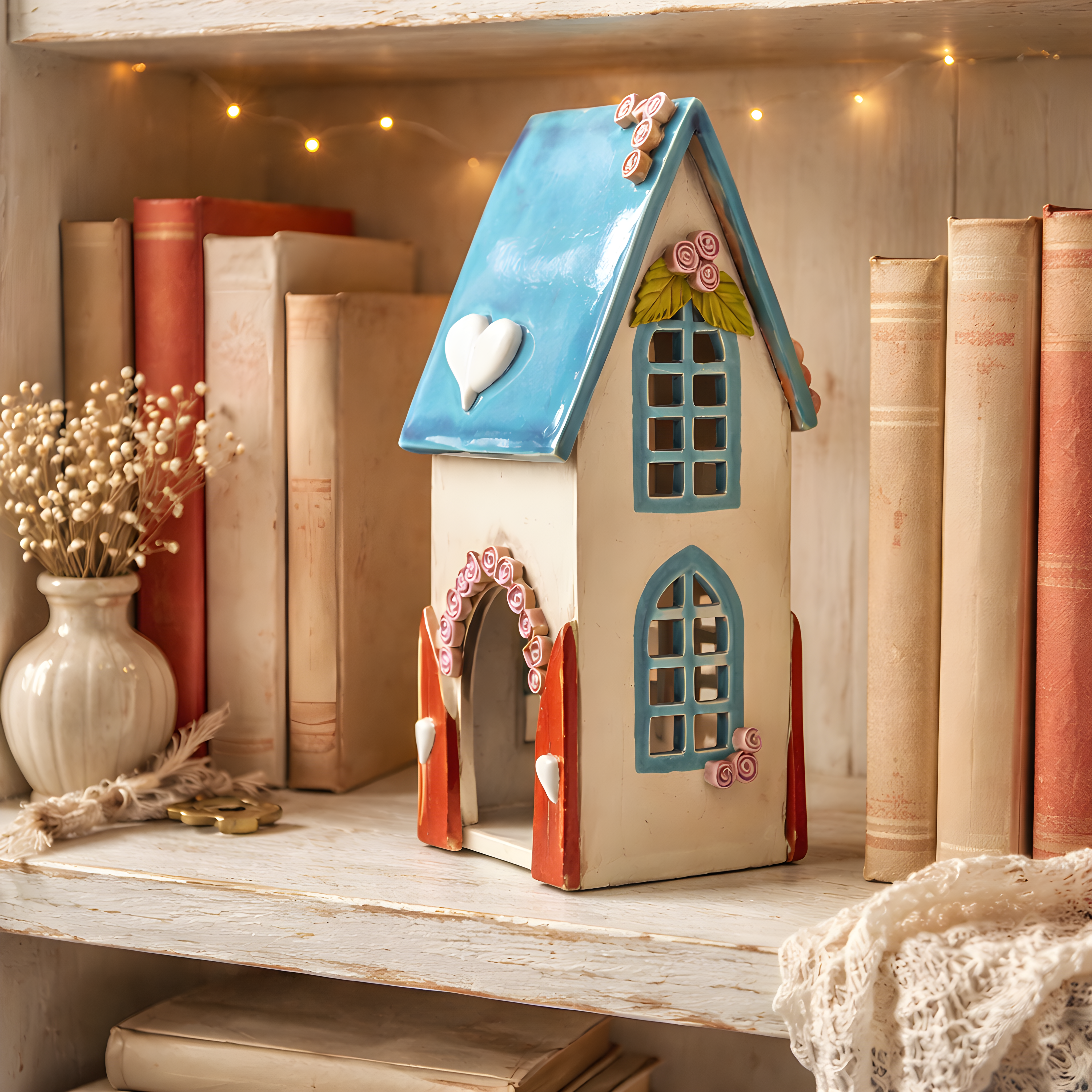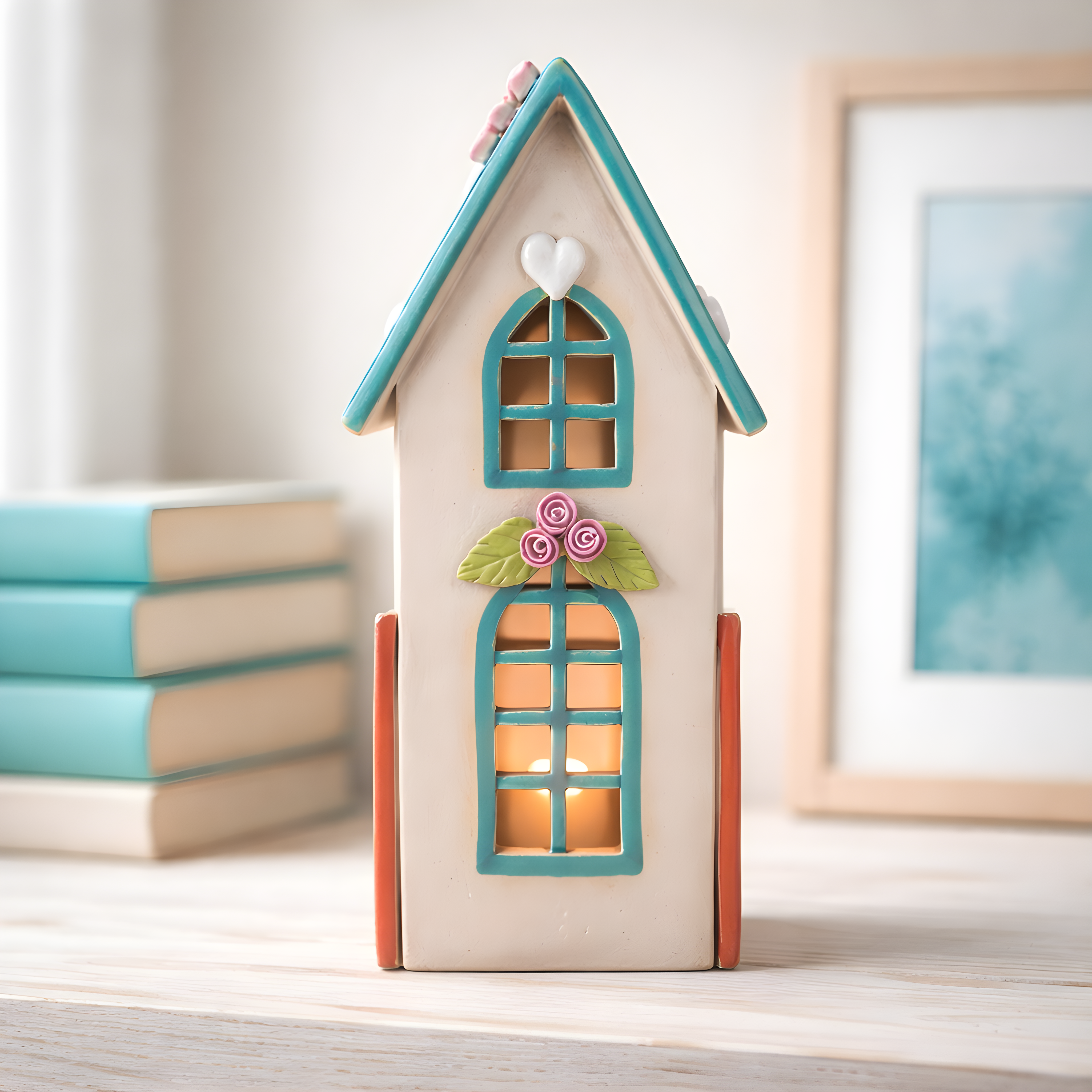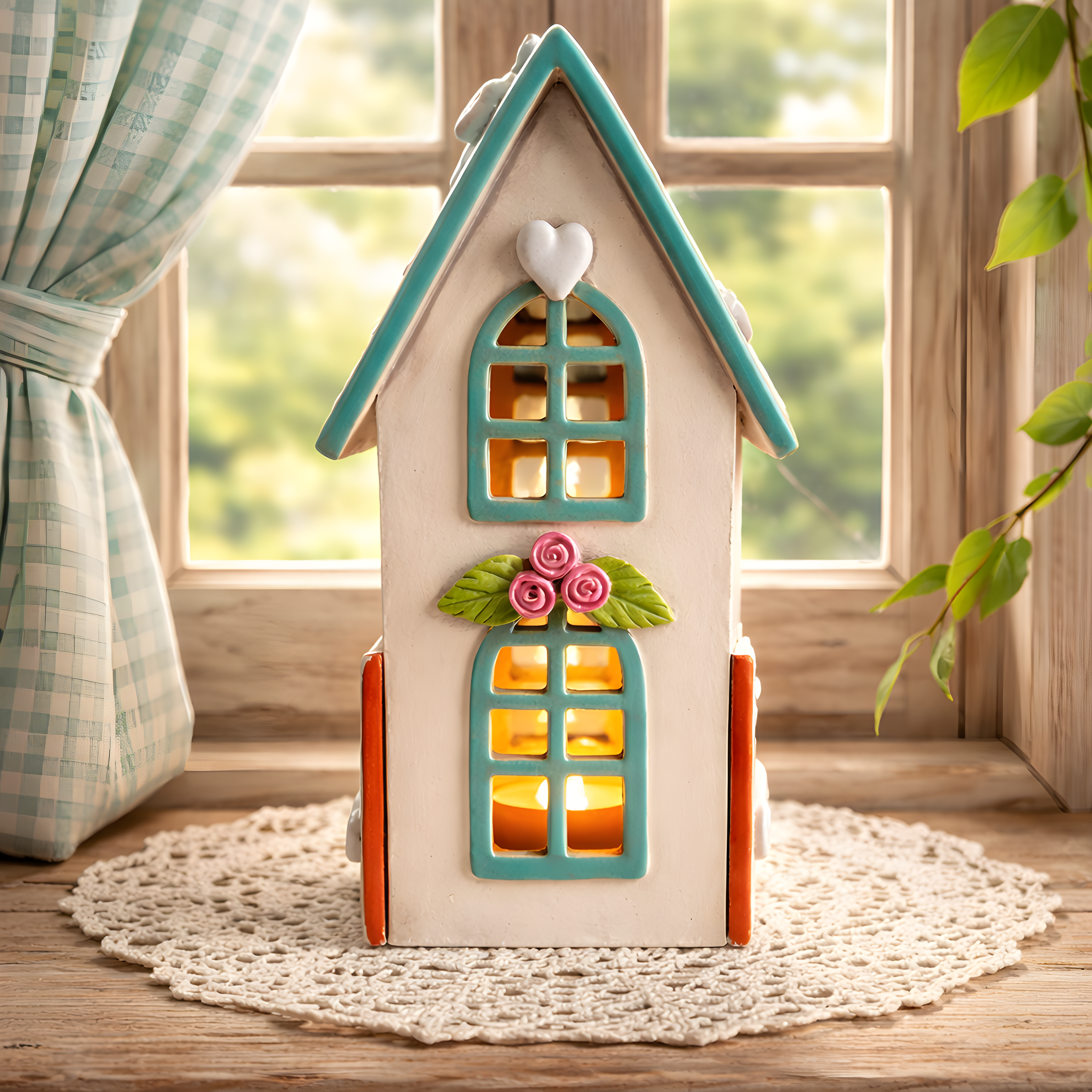 Ten uroczy ceramiczny domek to małe turkusowe marzenie – pełne światła, ciepła i delikatności.