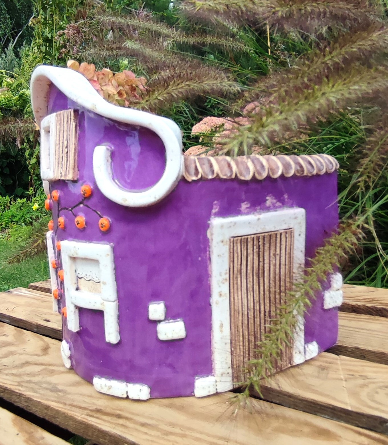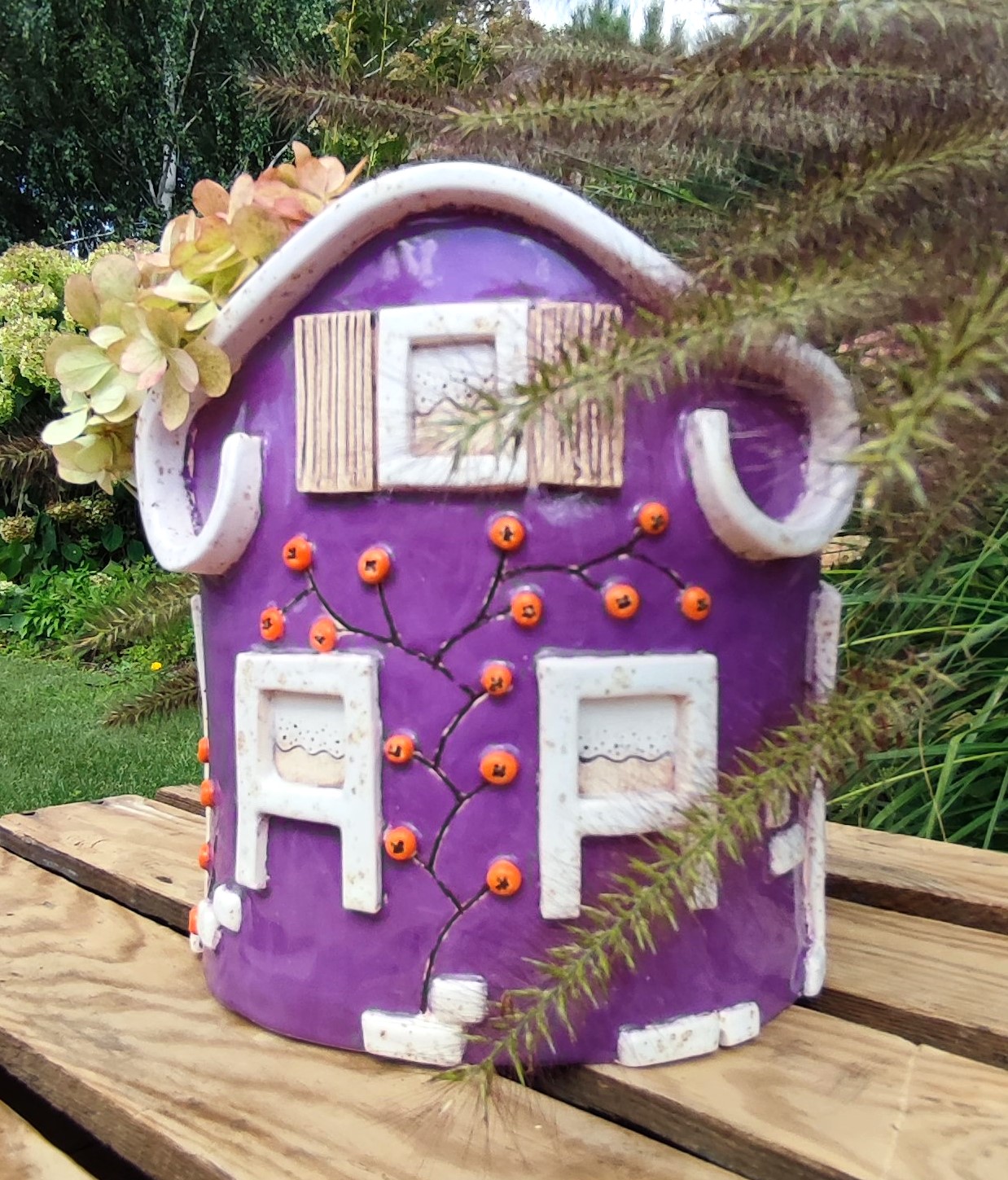 Szczególną uwagę zwraca intensywny, głęboki fiolet, który pięknie kontrastuje z białymi detalami i pomarańczowymi akcentami dekoracyjnymi.