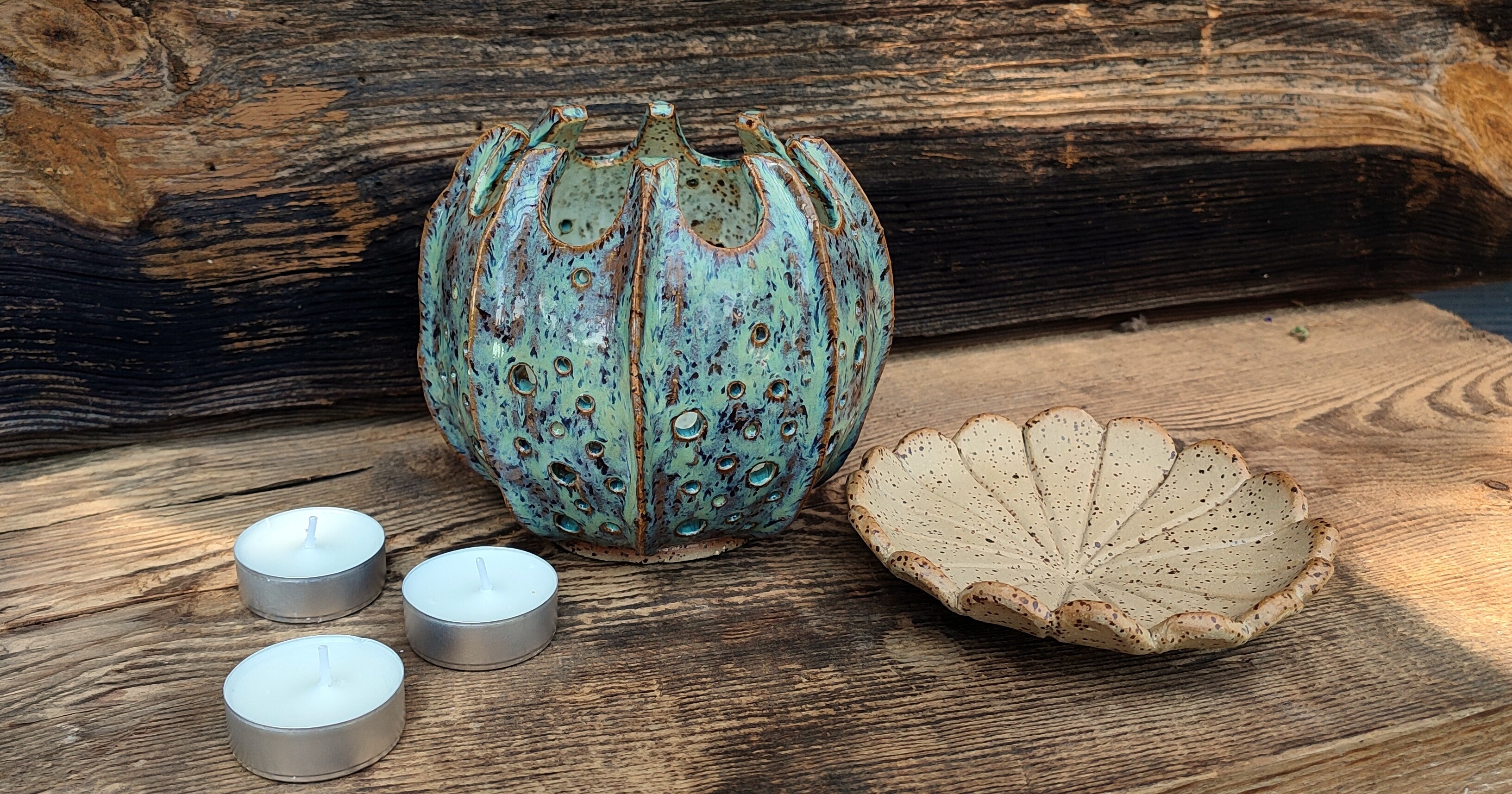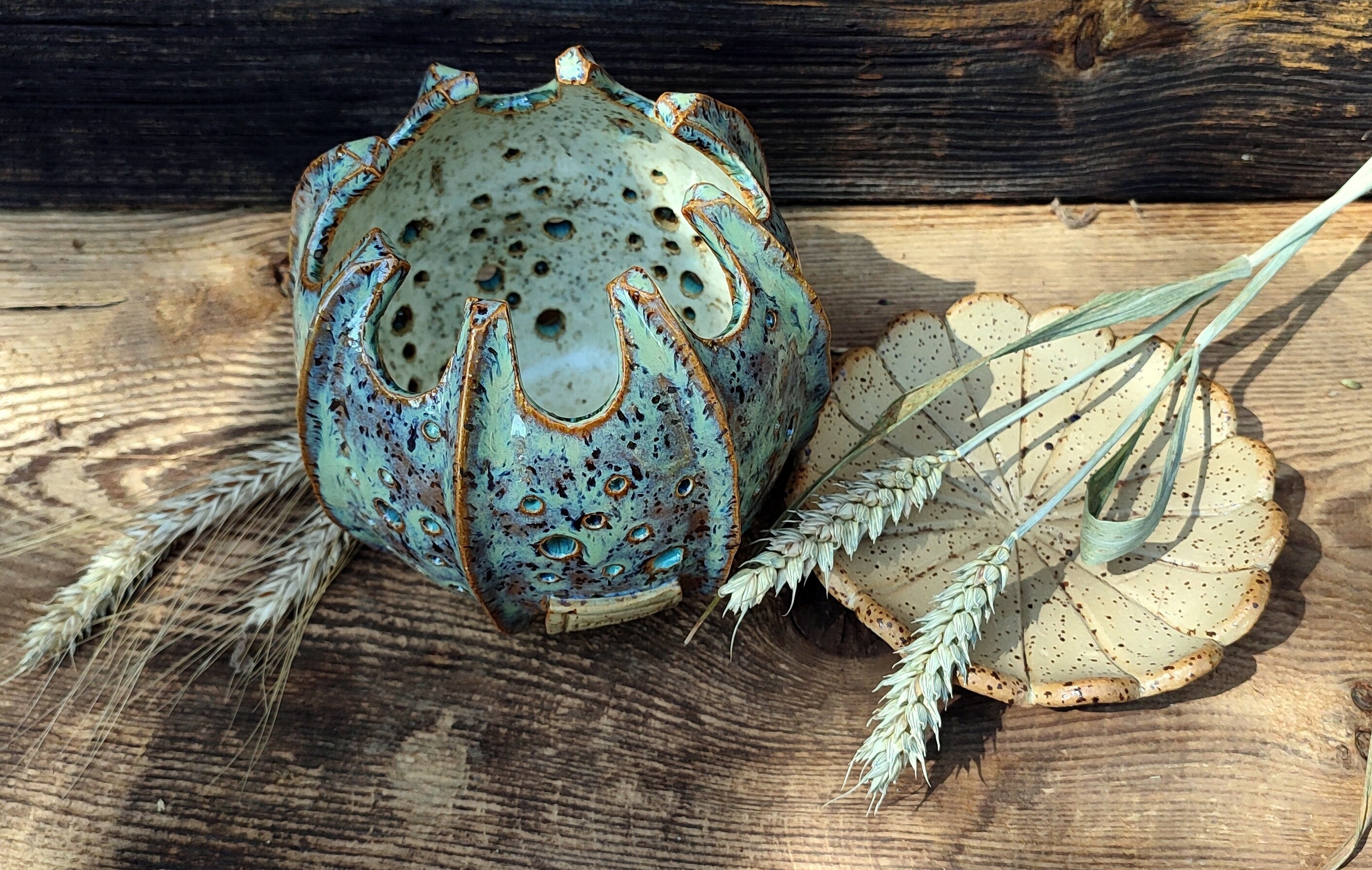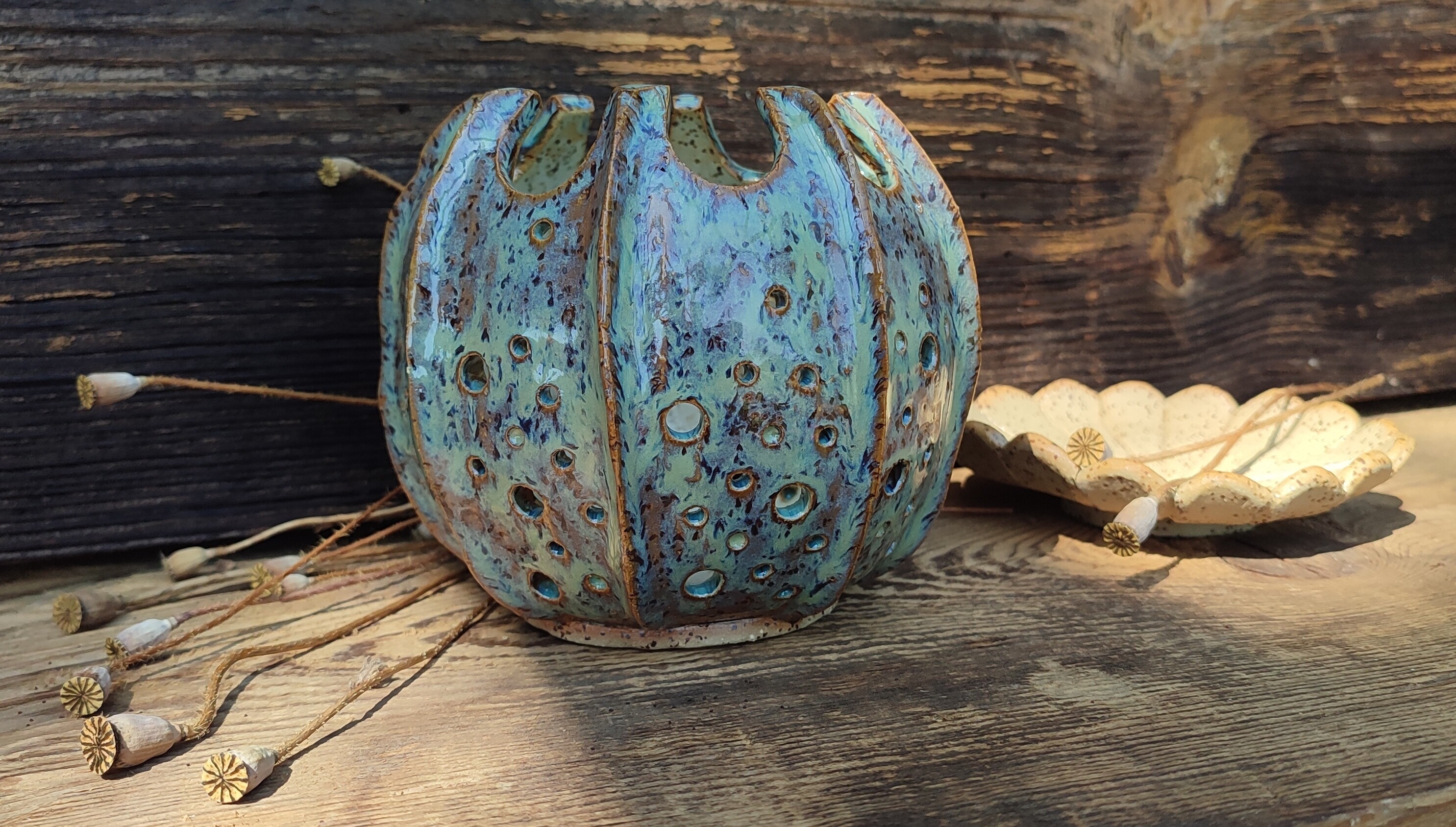 Każdy jej detal powstał z miłości do natury i rękodzieła – od organicznego kształtu przypominającego makową główkę, po delikatne szkliwa w odcieniach błękitu, turkusu i lazurowej zieleni.