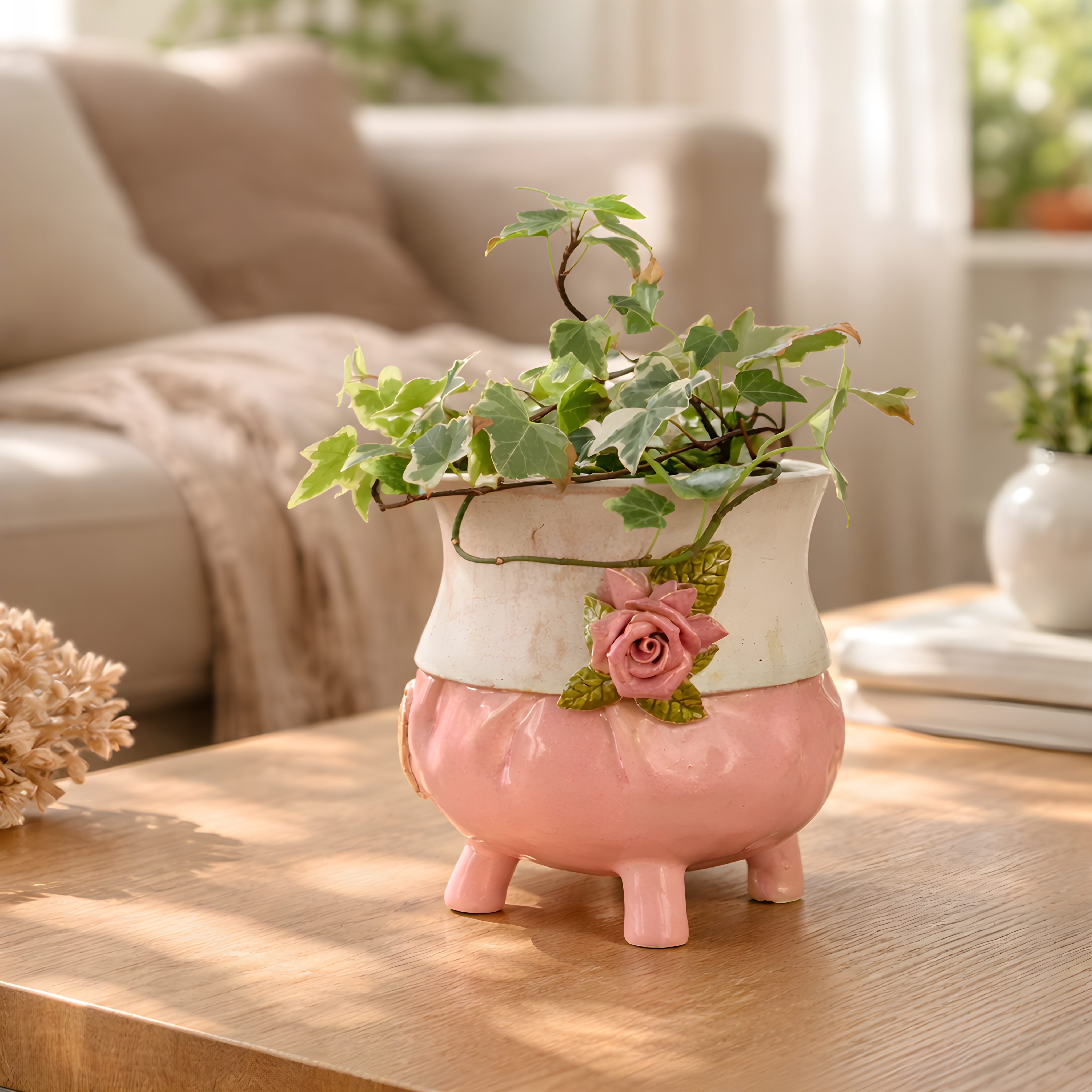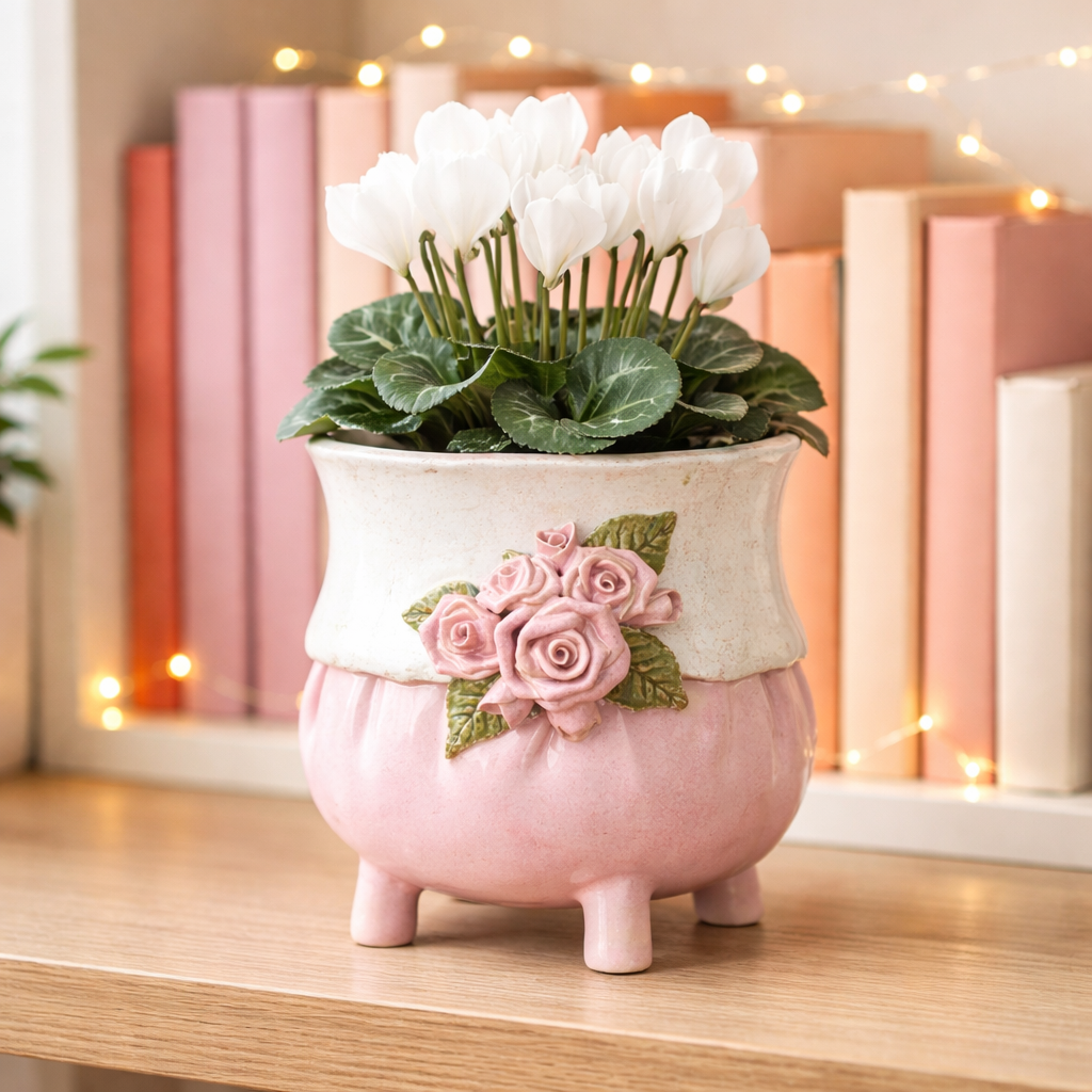 „Pudrowe Poranki” to doniczka ceramiczna, która wprowadza do wnętrza spokój i kobiecą subtelność.