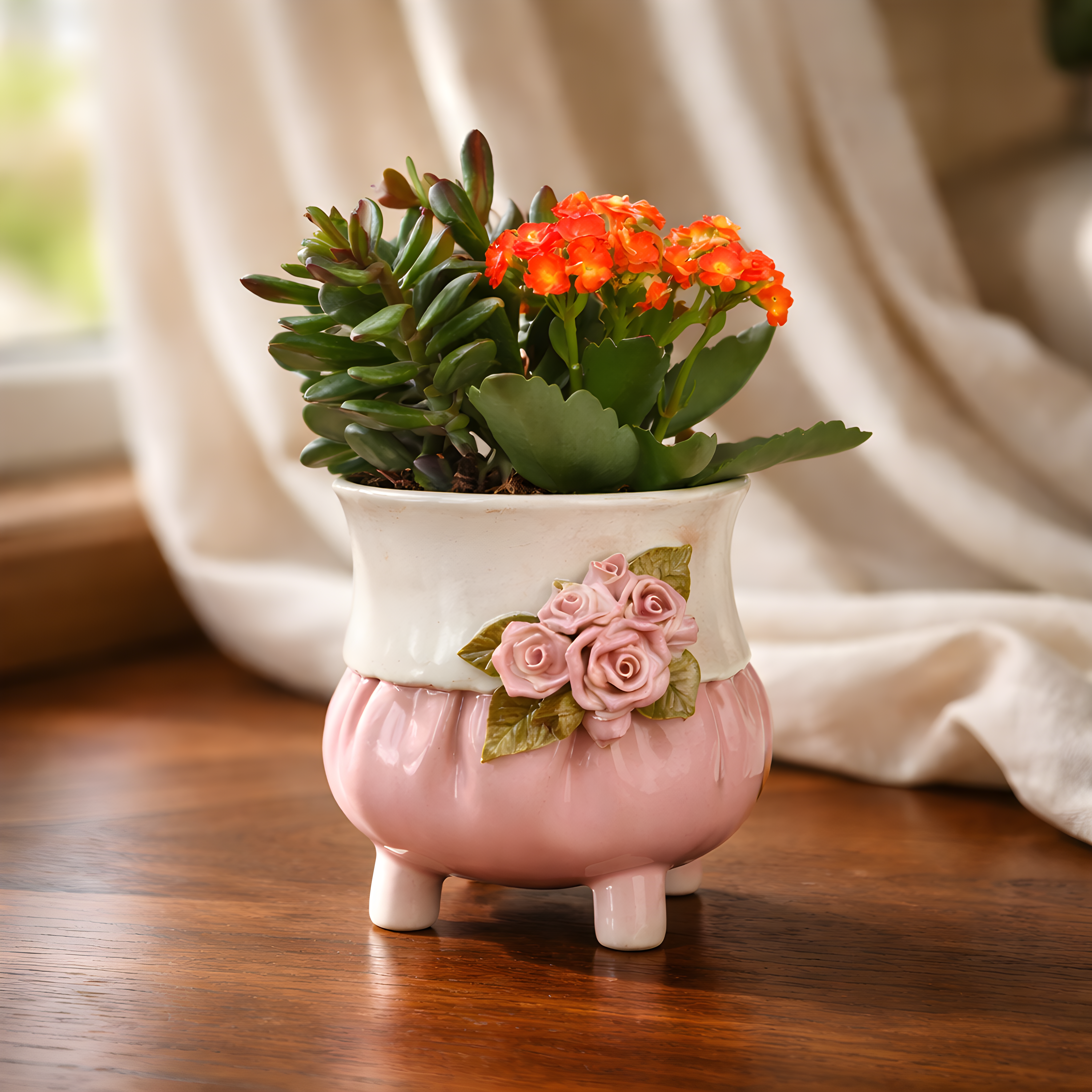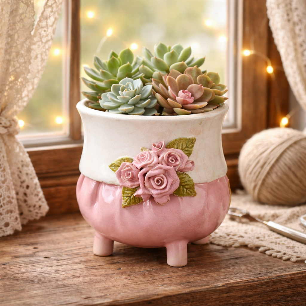 Każdy egzemplarz jest jedyny w swoim rodzaju, z lekko udrapowaną formą przypominającą miękki woreczek z tkaniny. Udekorowana ręcznie modelowanymi różyczkami i liśćmi, prezentuje sielski styl shabby chic w najpiękniejszym wydaniu.