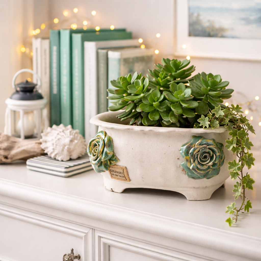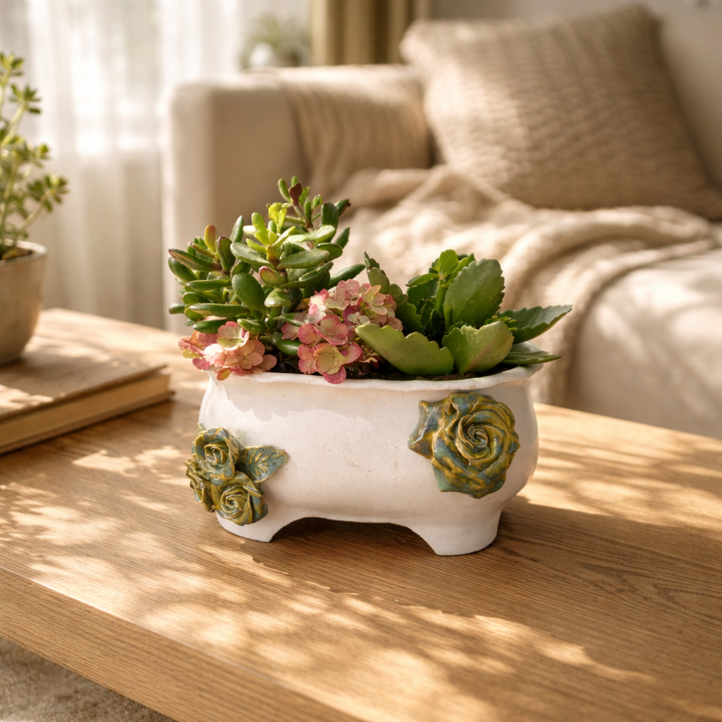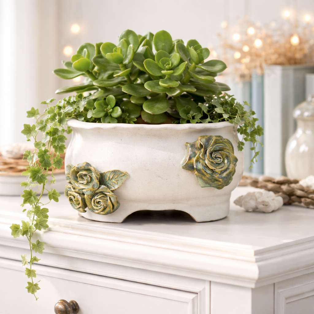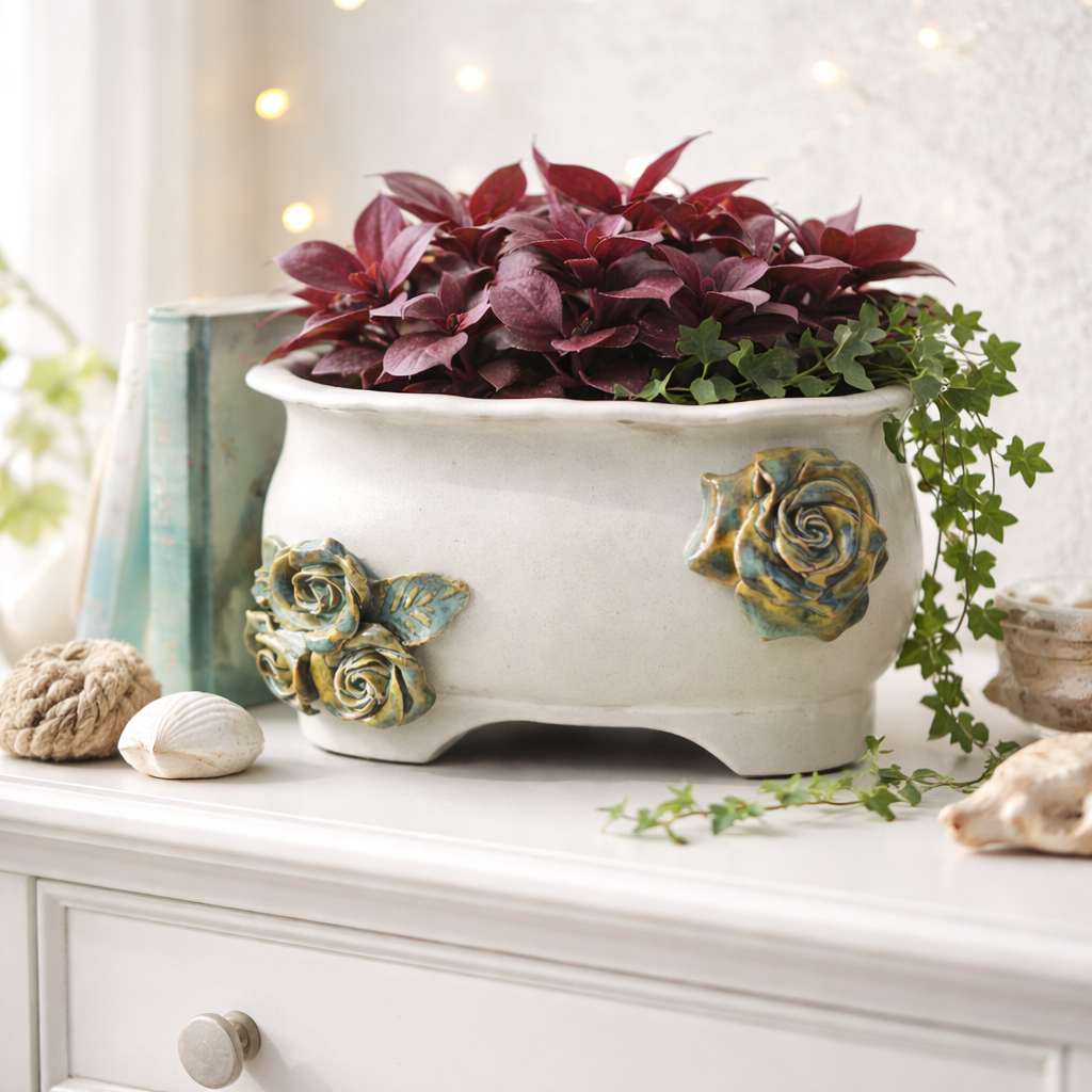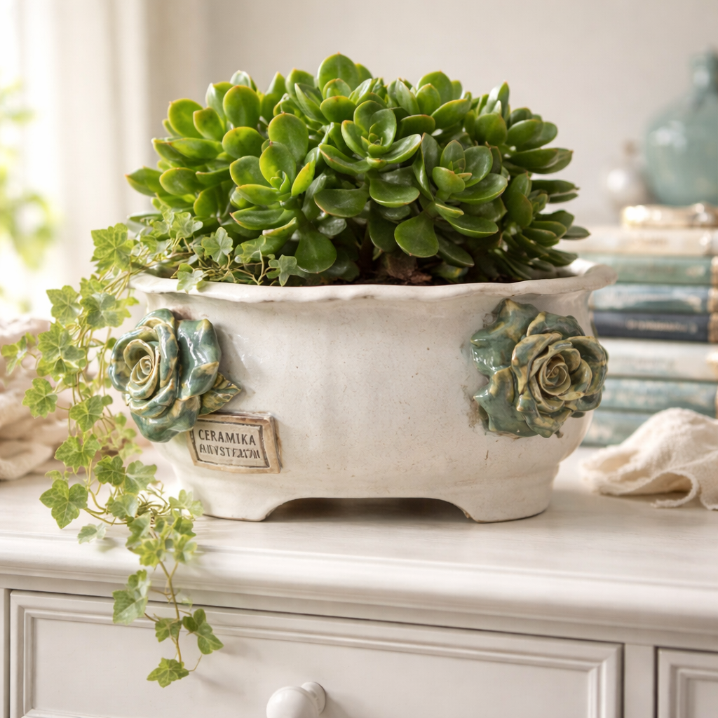 Każda róża została ręcznie ulepiona i indywidualnie szkliwiona, dzięki czemu każda doniczka jest niepowtarzalna – jak miniaturowe dzieło sztuki.