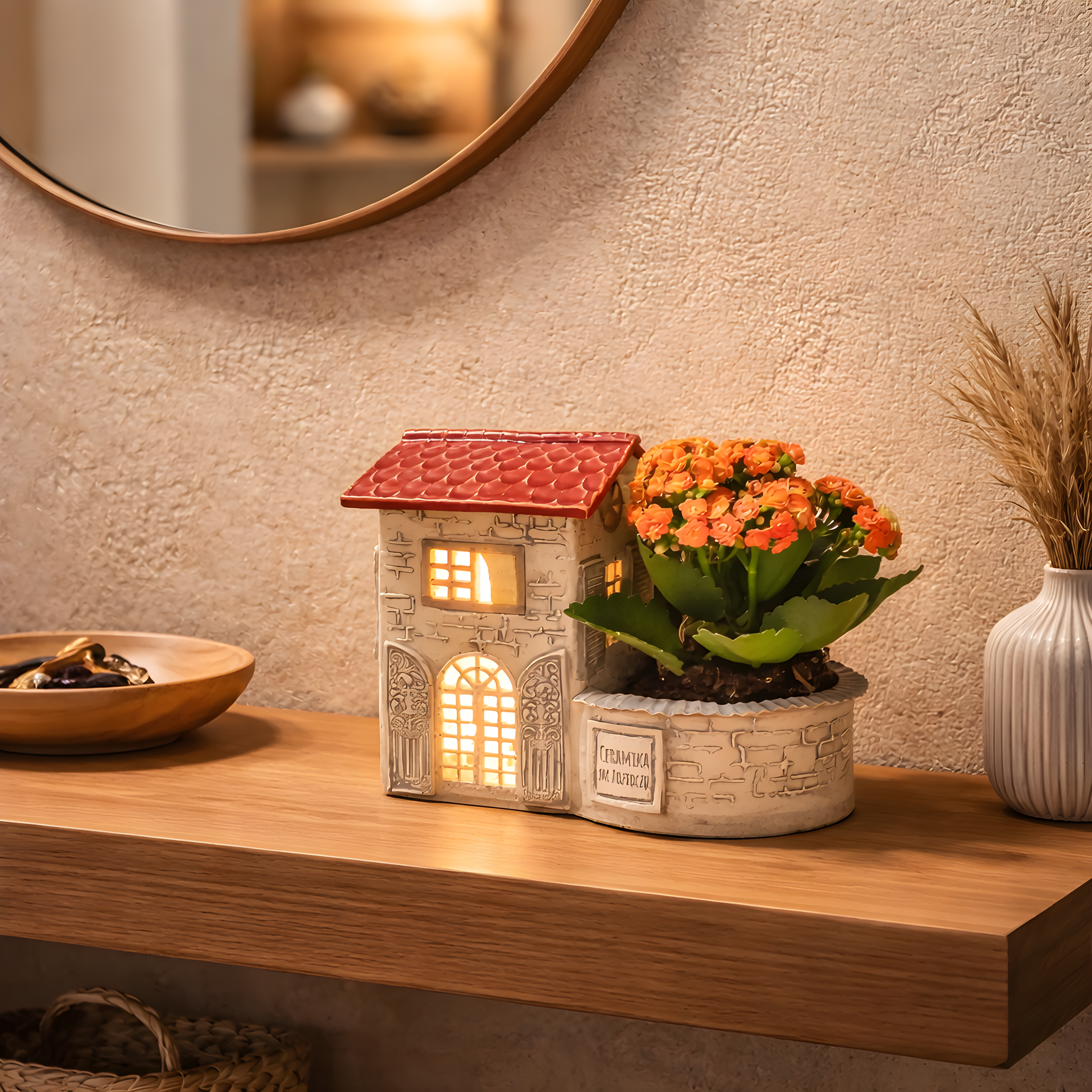Okna mają drobne zasłonki – detal, który sprawia wrażenie, że w środku naprawdę ktoś mieszka. Wieczorem, gdy zapalisz tealight, światło wypełnia wnętrze i prześwituje przez kratkowane okna, tworząc obraz małego, tętniącego życiem domu.