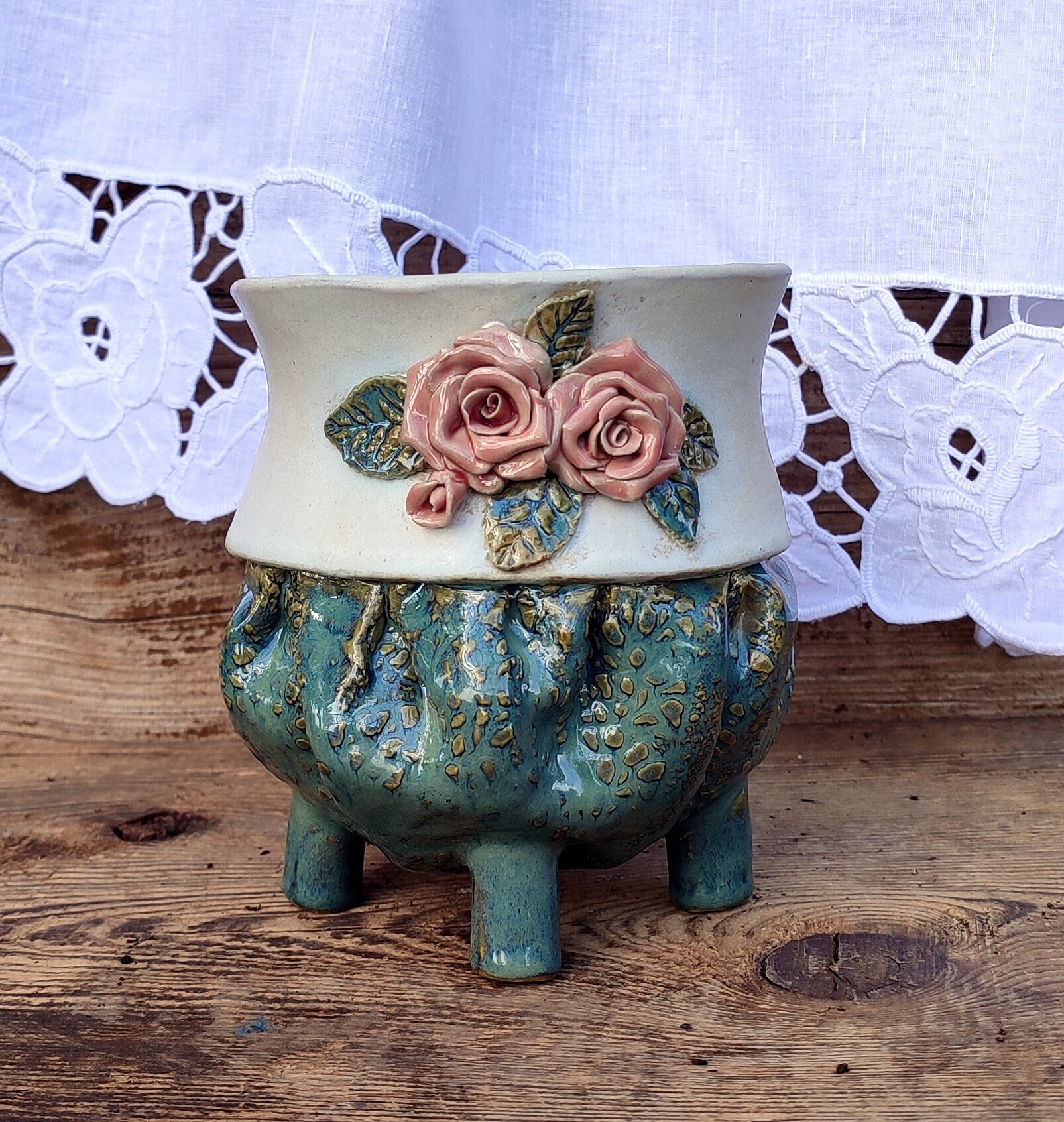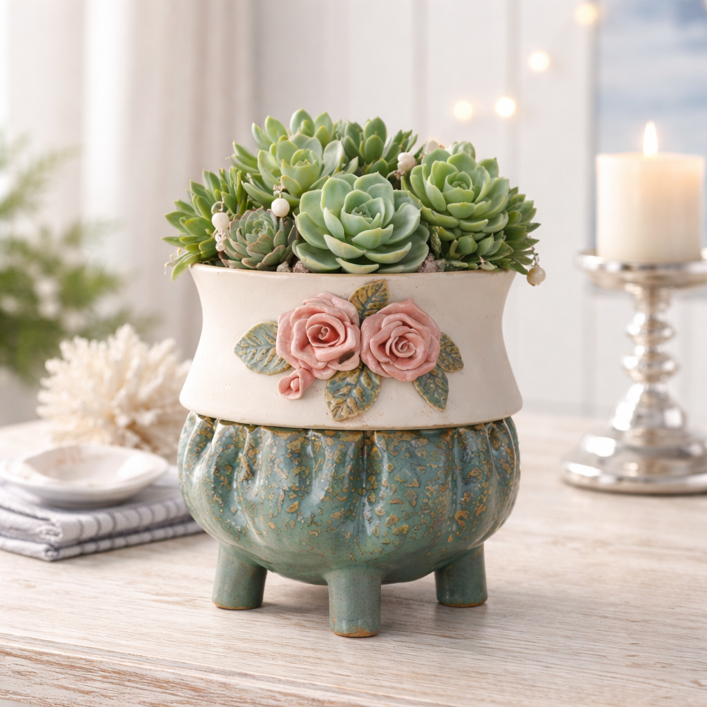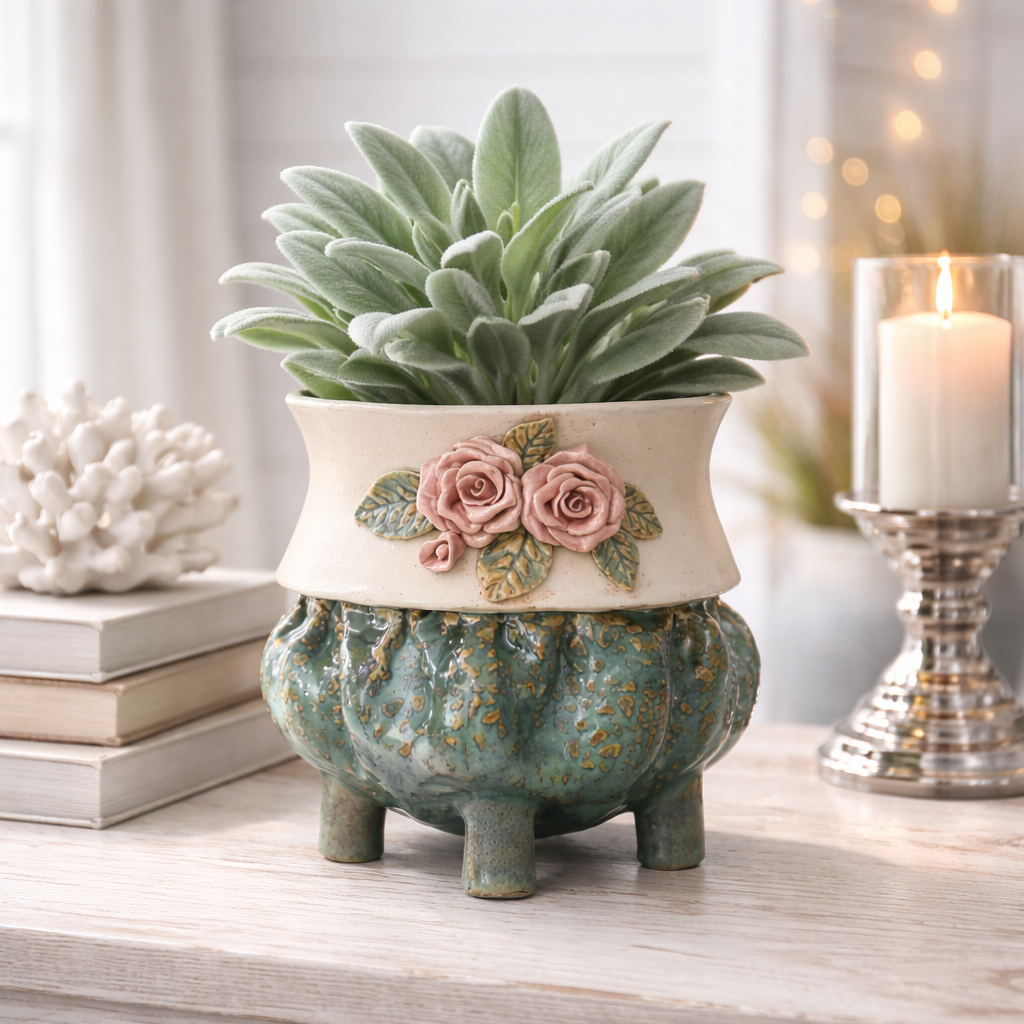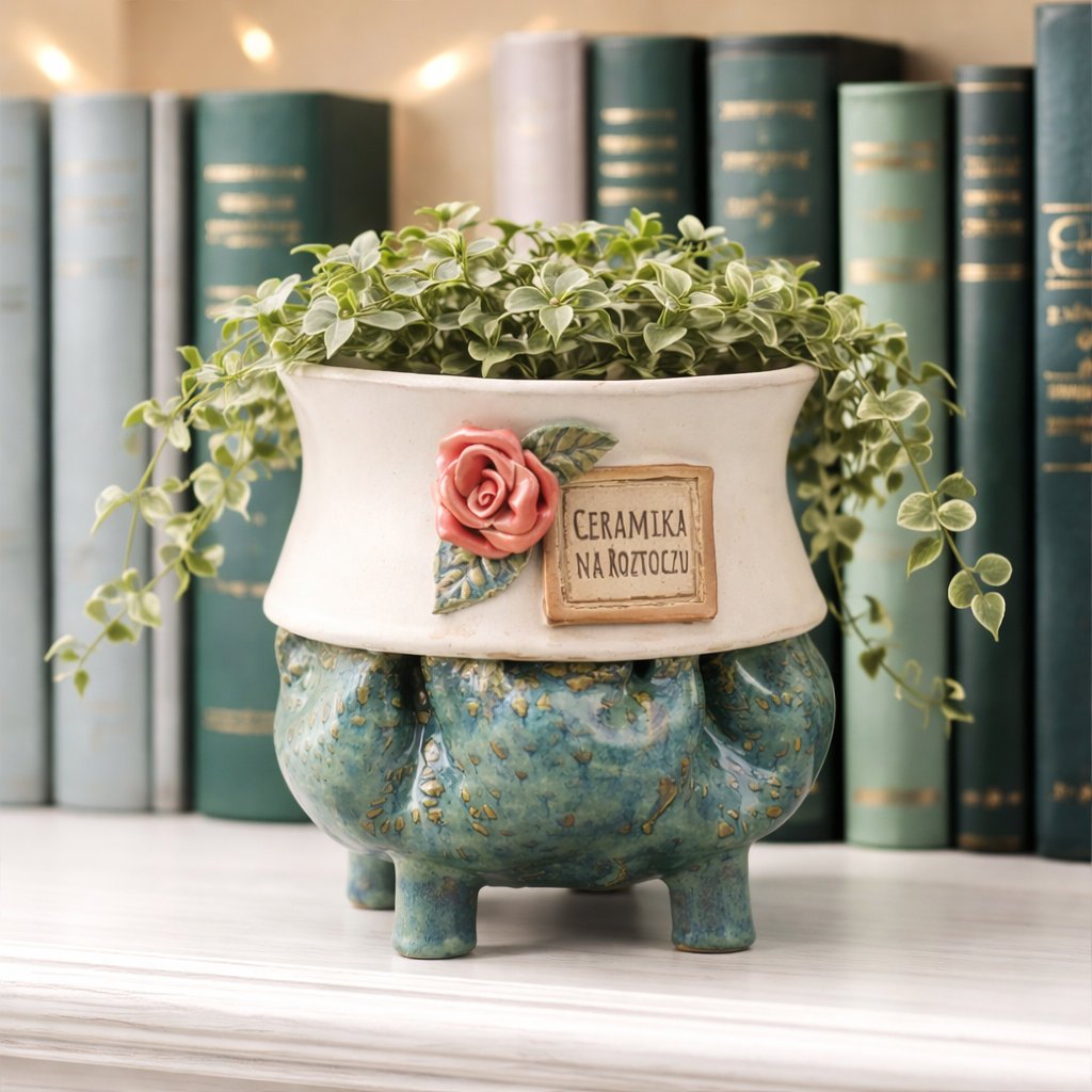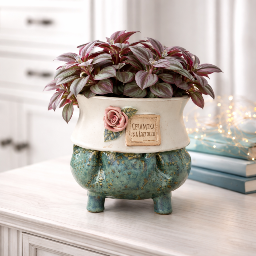 Na jasnym, kremowym rancie rozkwitają subtelne róże – ręcznie modelowane, pastelowe, jakby zroszone poranną mgłą. To połączenie natury i elegancji, które sprawia, że każda doniczka staje się małym dziełem sztuki użytkowej.