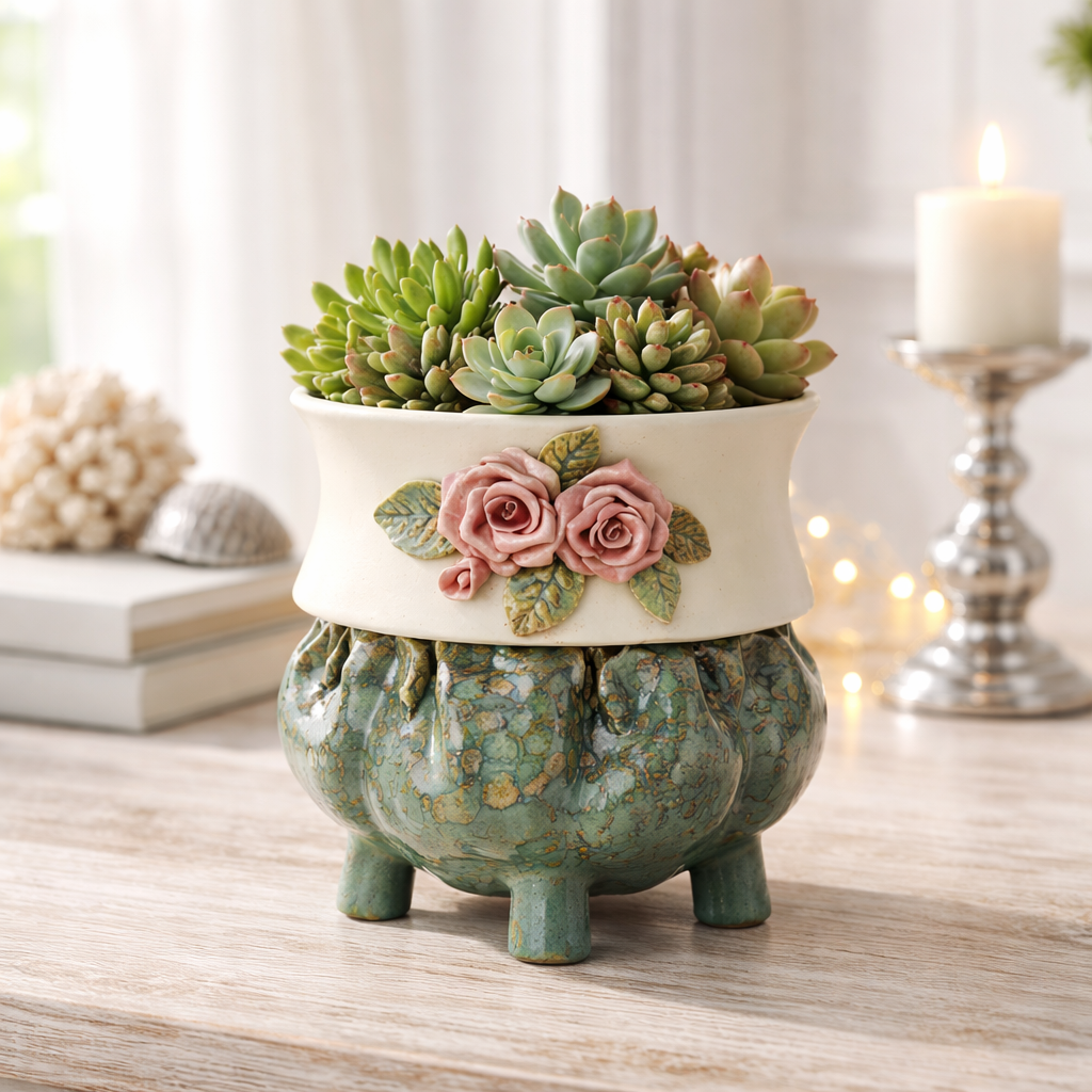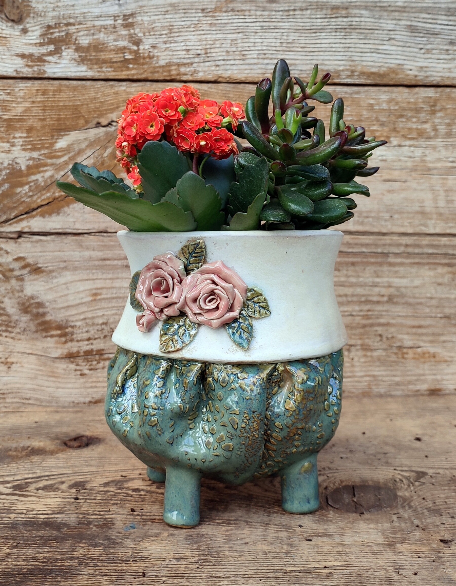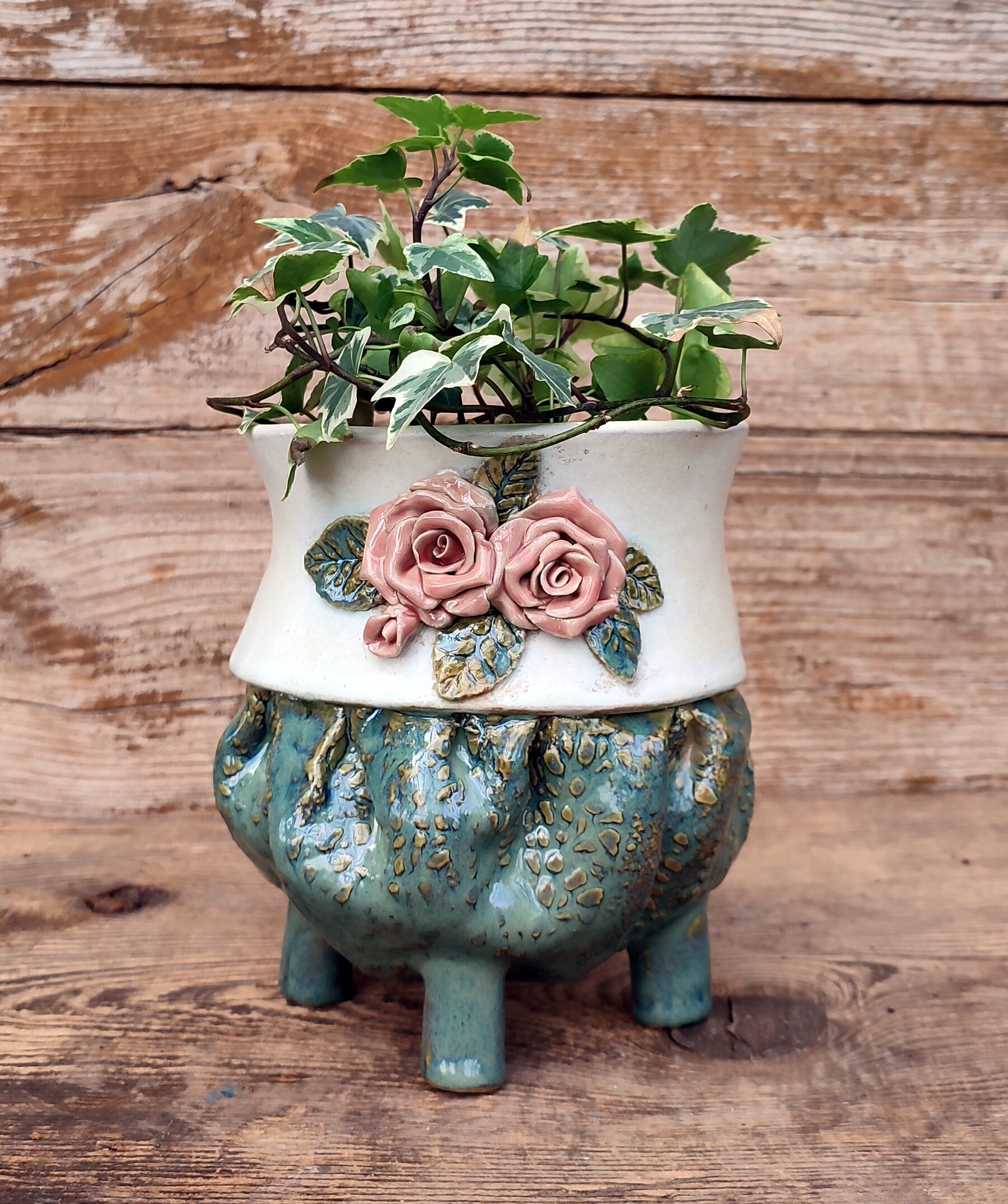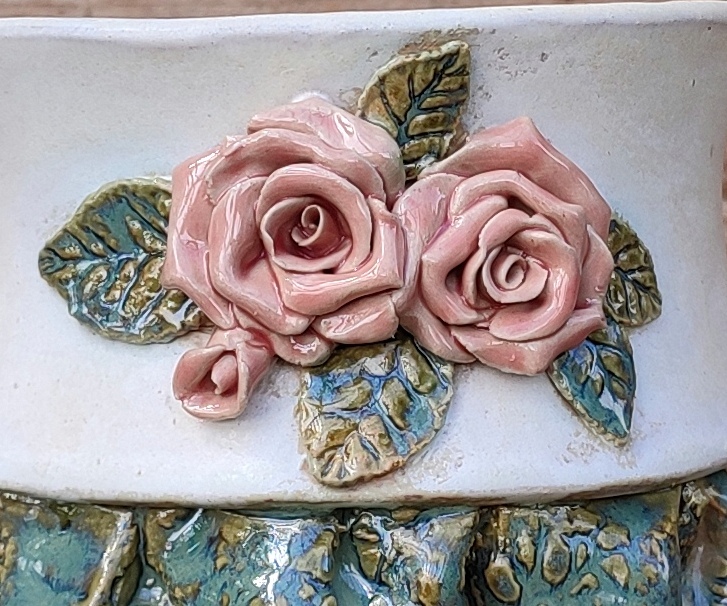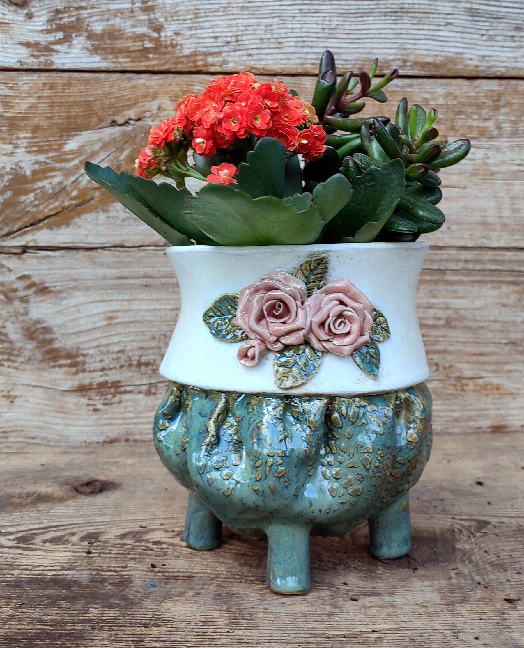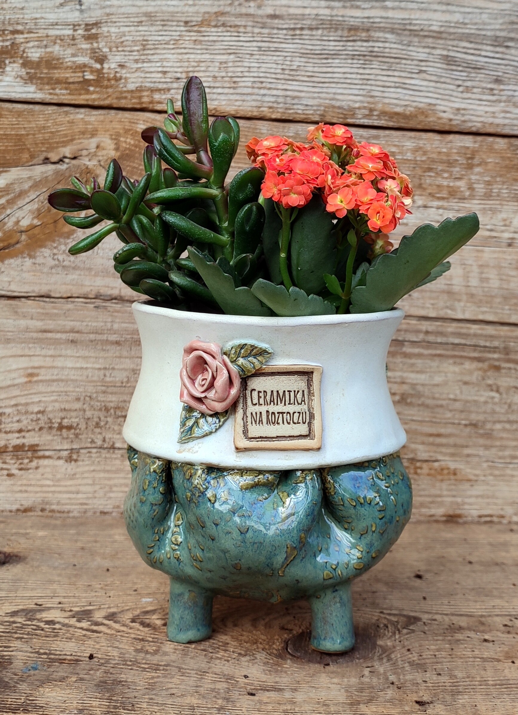 Na jasnym, kremowym rancie rozkwitają subtelne róże – ręcznie modelowane, pastelowe, jakby zroszone poranną mgłą. To połączenie natury i elegancji, które sprawia, że każda doniczka staje się małym dziełem sztuki użytkowej.